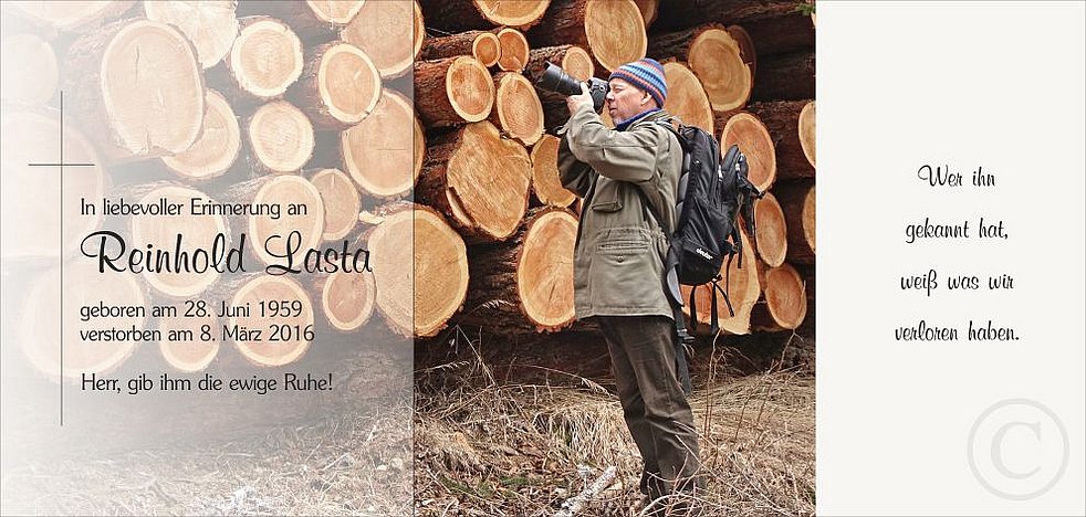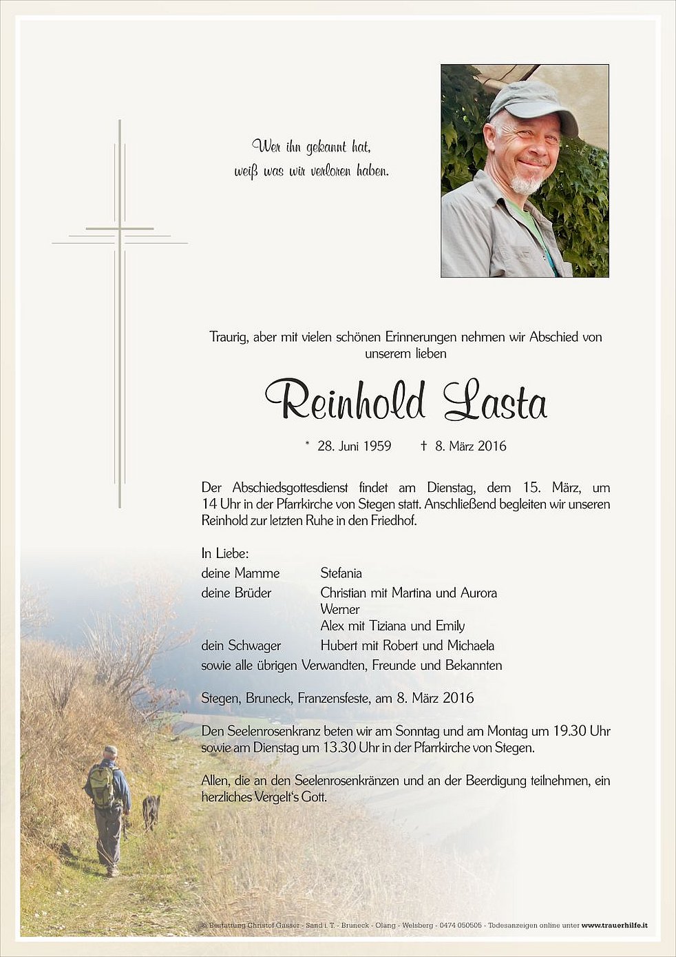 Der Abschiedsgottesdienst findet am Dienstag, dem 15. März, um 14 Uhr in der Pfarrkirche von Stegen statt. Anschließend begleiten wir unseren Reinhold zur letzten Ruhe in den Friedhof.