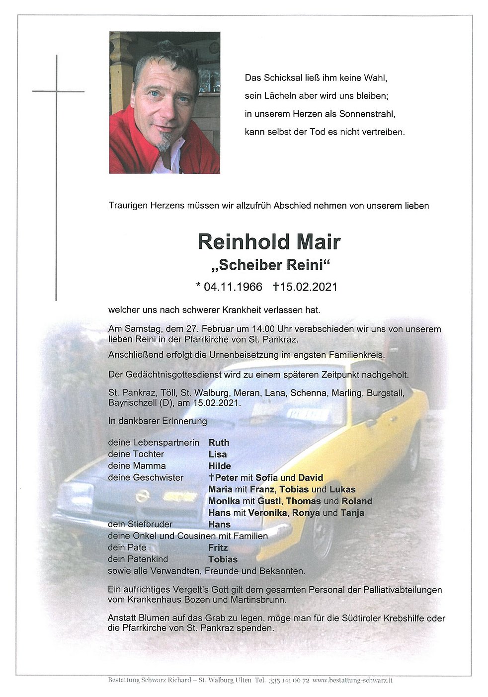 Anstatt Blumen auf das Grab zu legen, möge man für die Südtiroler Krebshilfe oder die Pfarrkirche von St. Pankraz spenden.