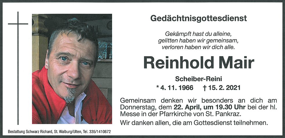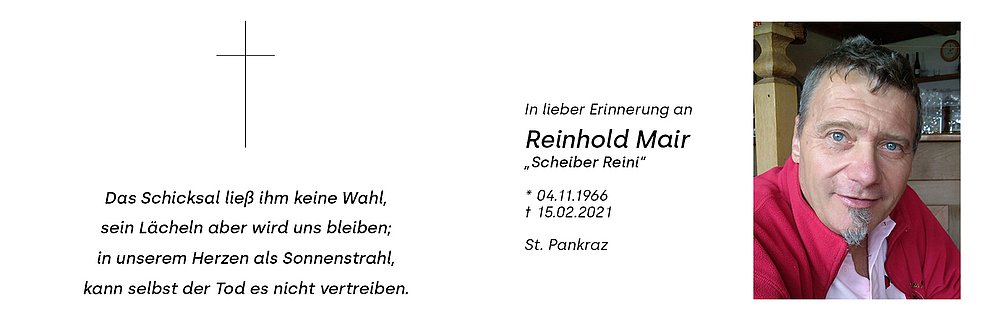 Am Samstag, dem 27. Februar um 14.00 Uhr verabschieden wir uns von unserem lieben Reini in der Pfarrkirche von St. Pankraz.