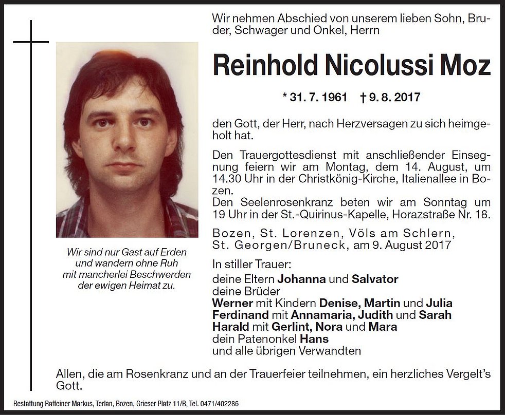 Den Trauergottesdienst mit anschlieβender Einsegnung feiern wir am Montag, dem 14. August, um 14.30 Uhr in der Christ-König-Kirche, Italienallee in Bozen.