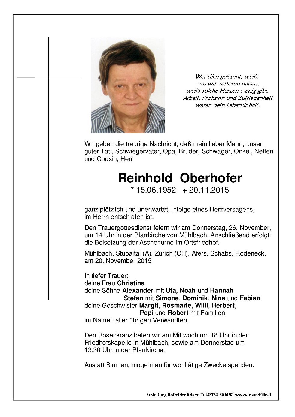 Wir geben die traurige Nachricht, daß mein lieber Mann, unser guter Tati, Schwiegervater, Opa, Bruder, Schwager, Onkel, Neffen und Cousin, Herr
