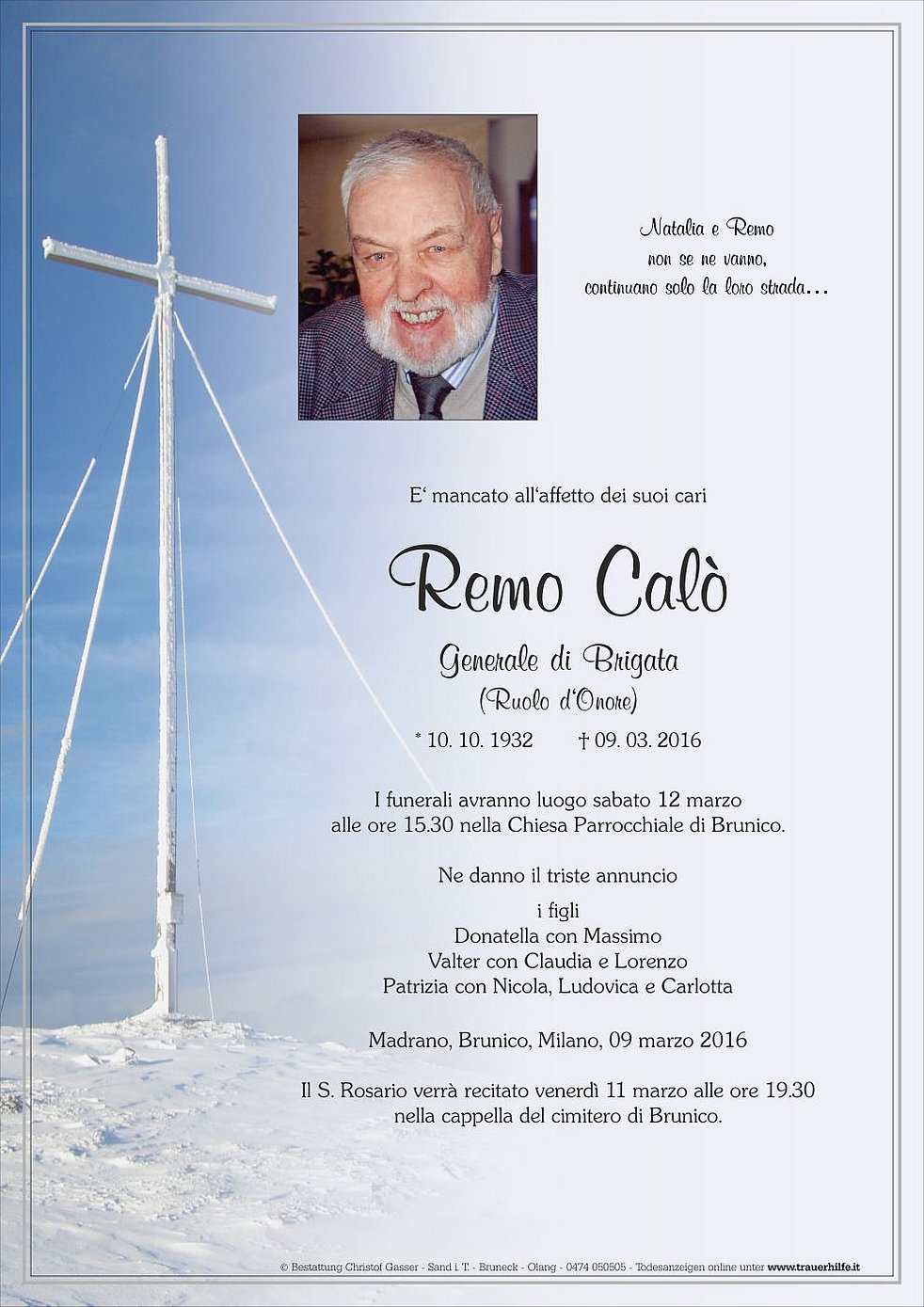 Der Trauergottesdienst findet am Samstag, dem 12. März, um 15.30 Uhr in der Pfarrkirche von Bruneck statt.
