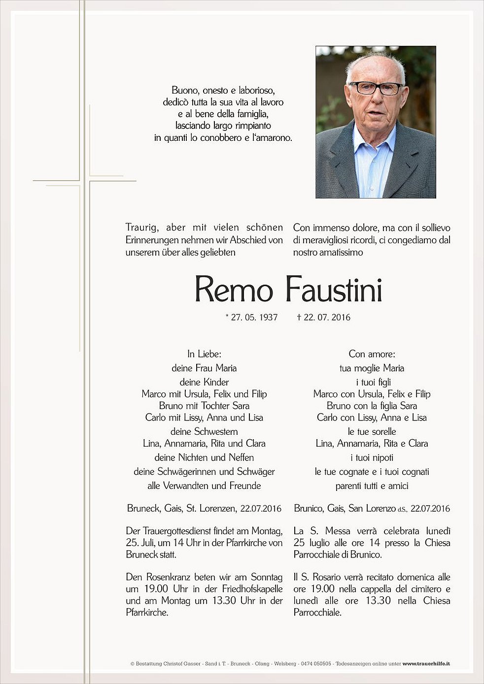 Der Trauergottesdienst findet am Montag, 25. Juli, um 14 Uhr in der Pfarrkirche von Bruneck statt.