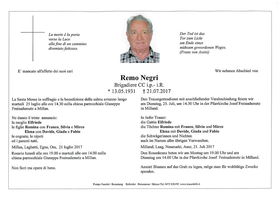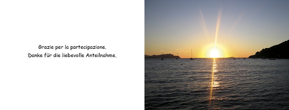 Gedankt sei dem Hausarzt Dr. Santifaller, den Ärzten und dem Pflegepersonal der Abteilung Medizin Süd des Brixner Krankenhauses und dem Pflegepersonal des Bürgerheimes, 5. Wohnbereich, für die liebevolle Betreuung sowie allen, die an den Rosenkränzen und an der Verabschiedung teilnehmen.