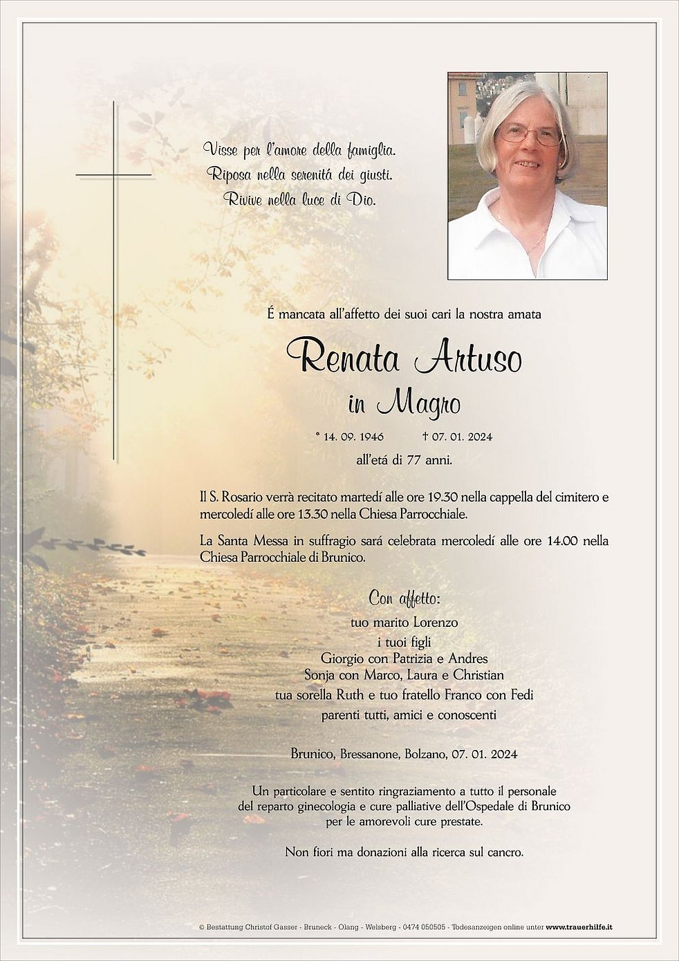 La Santa Messa in suffragio sará celebrata mercoledí alle ore 14.00 nella Chiesa Parrocchiale di Brunico.