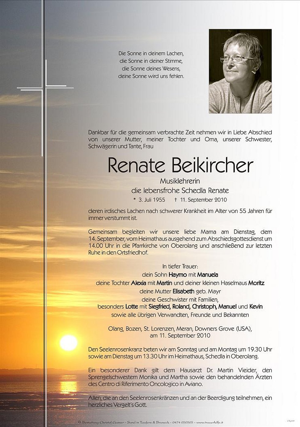 Gemeinsam begleiten wir unsere liebe Mama am Dienstag, dem 14. September, vom Heimathaus ausgehend zum Abschiedsgottesdienst um 14.00 Uhr in die Pfarrkirche von Oberolang und anschließend zur letzten Ruhe in den Ortsfriedhof.