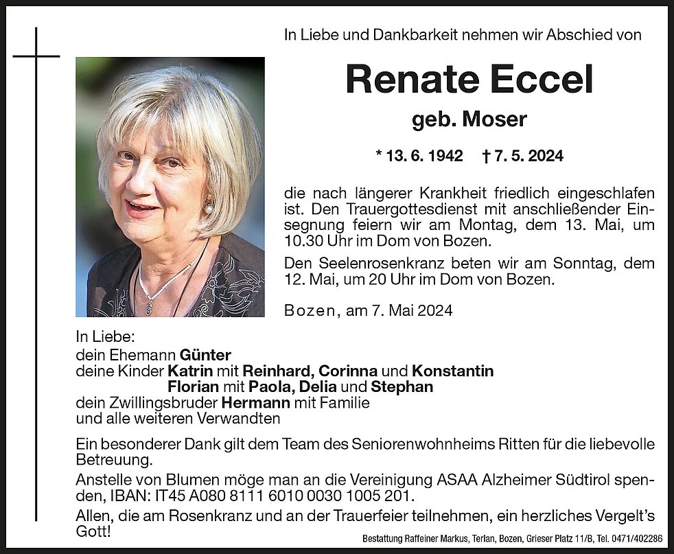 Anstelle von Blumen möge man an die Vereinigung ASAA Alzheimer Südtirol spenden.