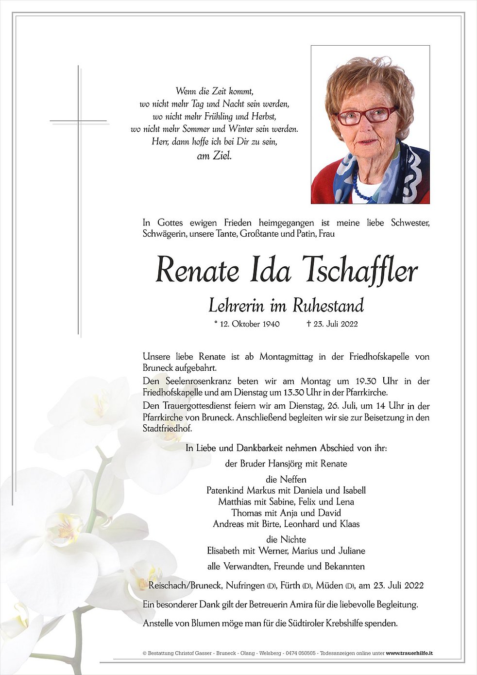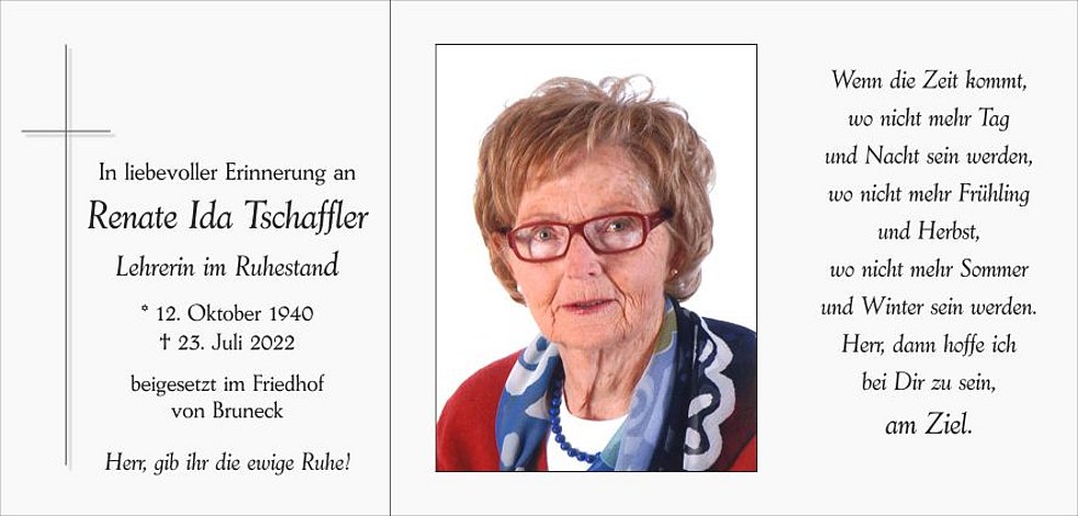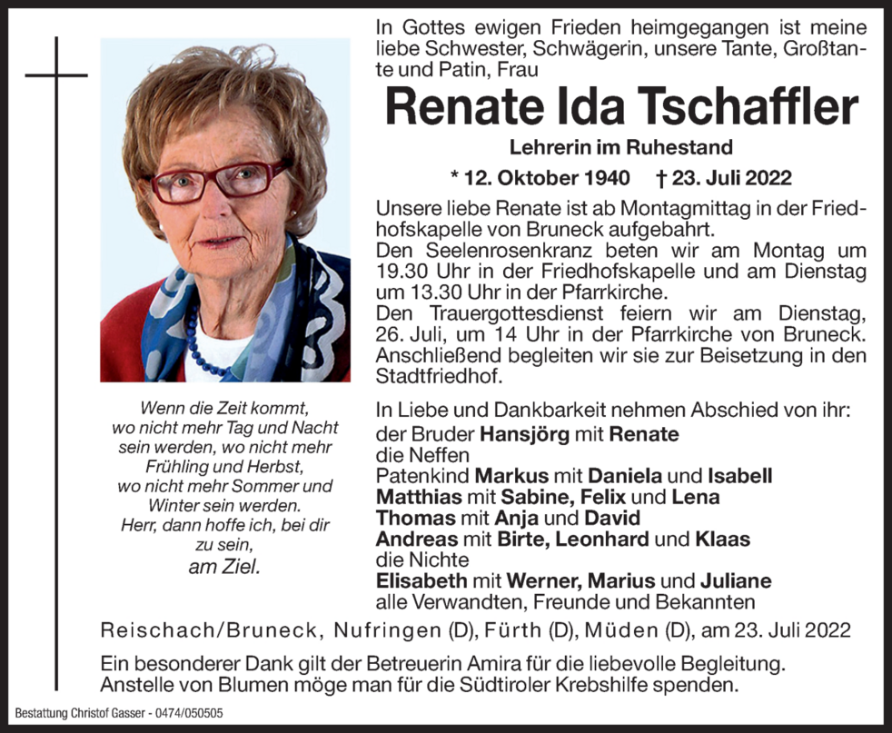 Den Trauergottesdienst feiern wir am Dienstag, 26. Juli, um 14 Uhr in der Pfarrkirche von Bruneck. Anschließend begleiten wir sie zur Beisetzung in den Stadtfriedhof.