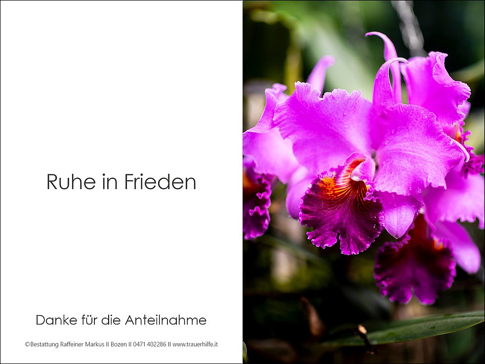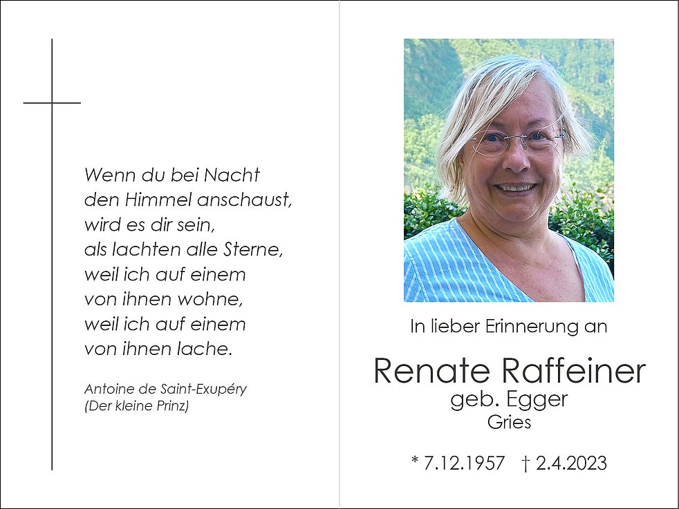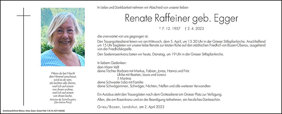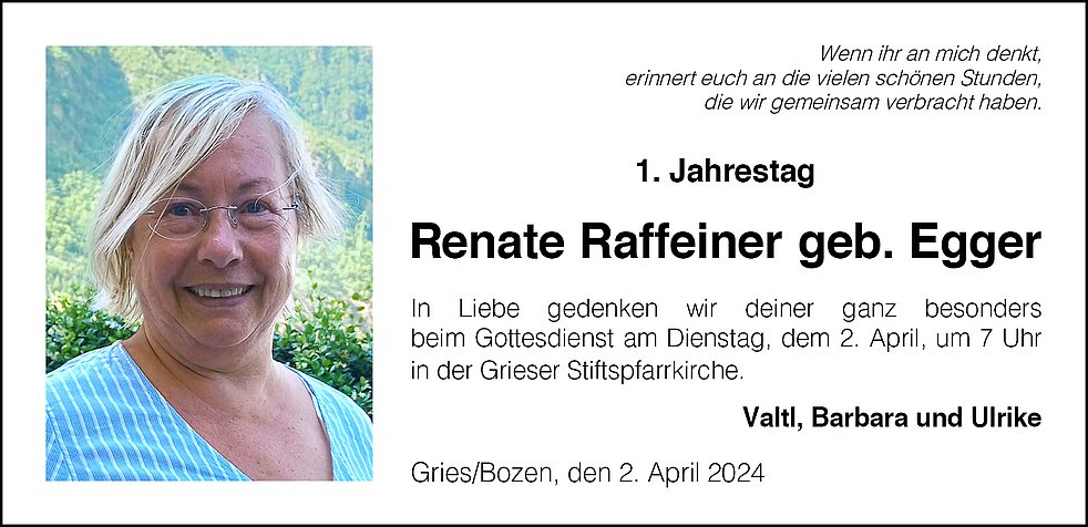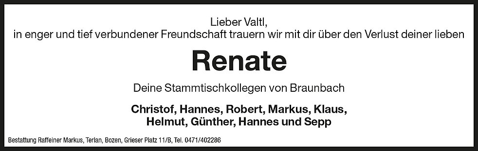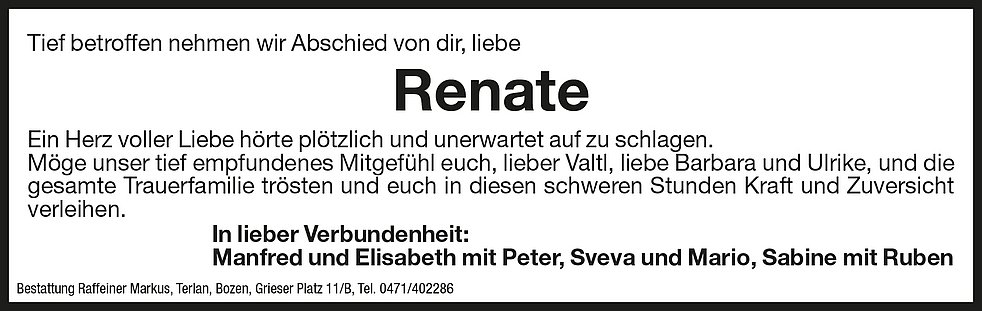 Den Trauergottesdienst feiern wir am Mittwoch, dem 5. April, um 13.30 Uhr in der Grieser Stiftspfarrkirche. Anschließend um 15 Uhr begleiten wir unsere liebe Renate zur letzten Ruhe auf den städtischen Friedhof von Bozen-Oberau, ausgehend von der Friedhofskapelle.