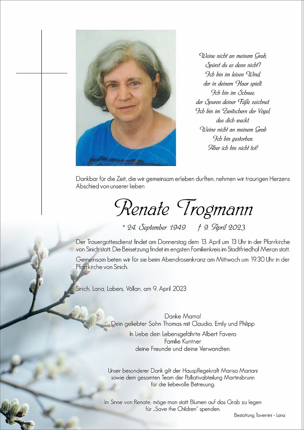 Mein herzliches Beileid. Mit Renate verband mich eine langjährige Freundschaft, die bis in die Studienzeit zurück reicht. Renate war immer hilfsbereit, freundlich und bescheiden. So werde ich sie in Erinnerung behalten.