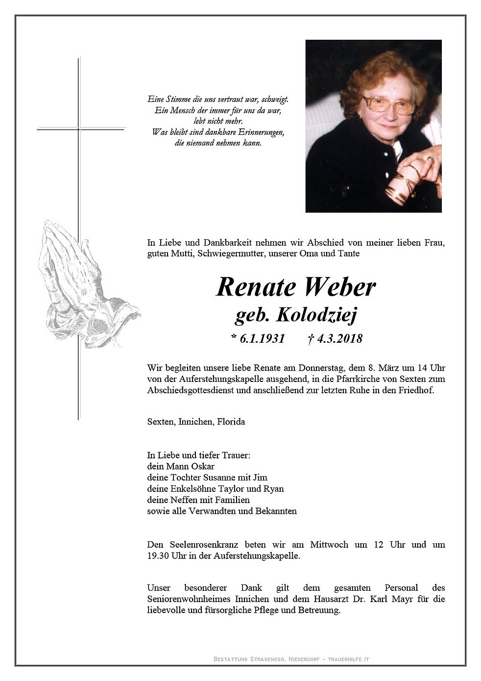 Wir begleiten unsere liebe Renate am Donnerstag, dem 8. März um 14 Uhr von der Auferstehungskapelle ausgehend, in die Pfarrkirche von Sexten zum Abschiedsgottesdienst und anschließend zur letzten Ruhe in den Friedhof.