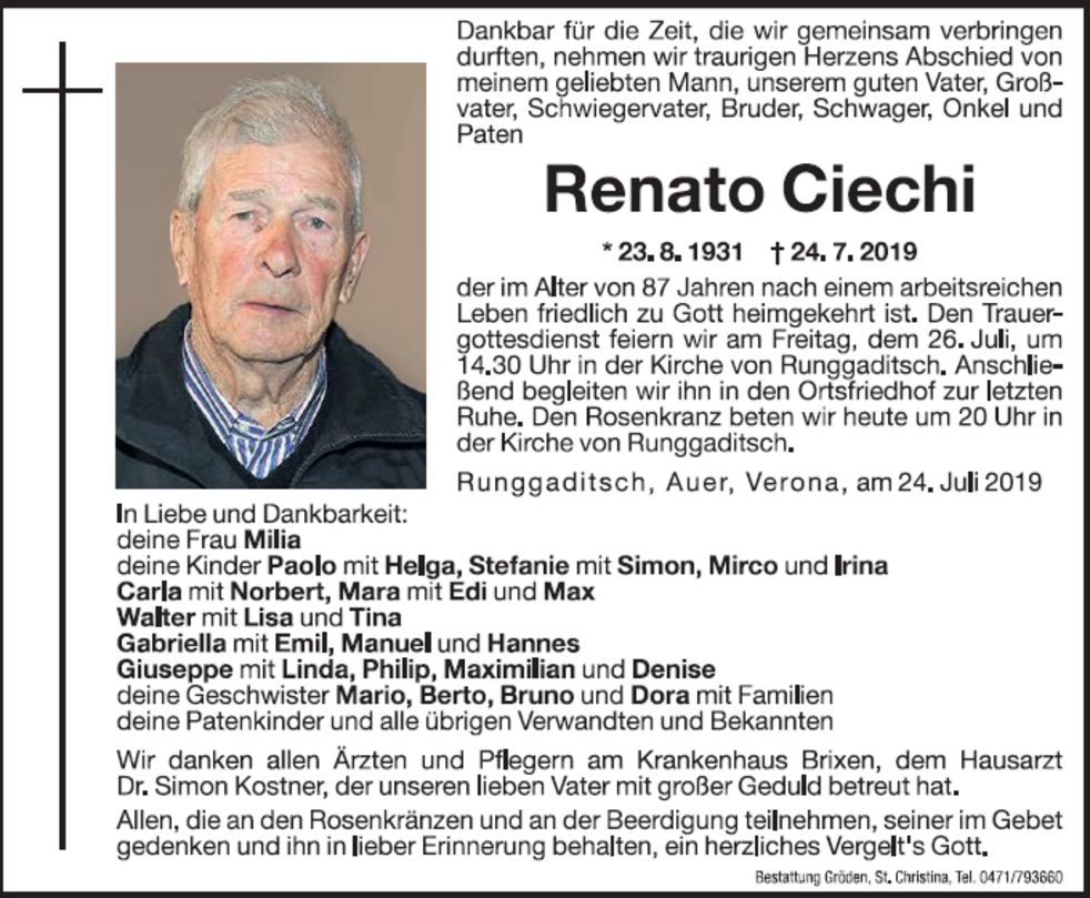 Wir danken allen Ärzten und Pflegern im Krankenhaus Brixen und dem Hausarzt Dr. Simon Kostner, der unseren lieben Vater mit großer Geduld betreut hat.
