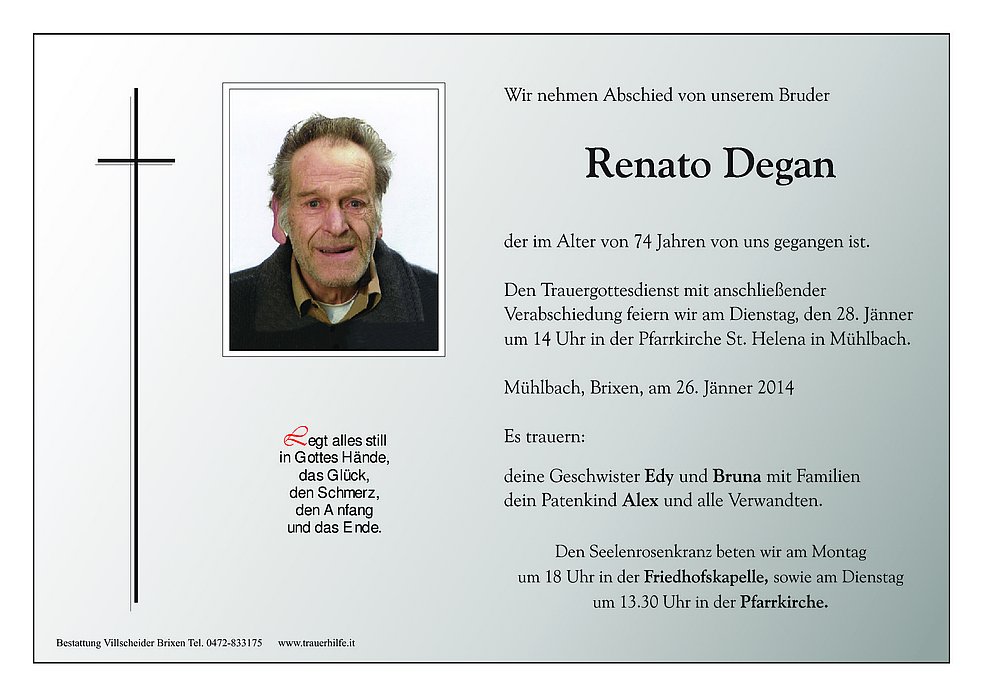 Den Trauergottesdienst mit anschließender Verabschiedung feiern wir am Dienstag, den 28. Jänner um 14 Uhr in der Pfarrkirche St. Helena in Mühlbach.