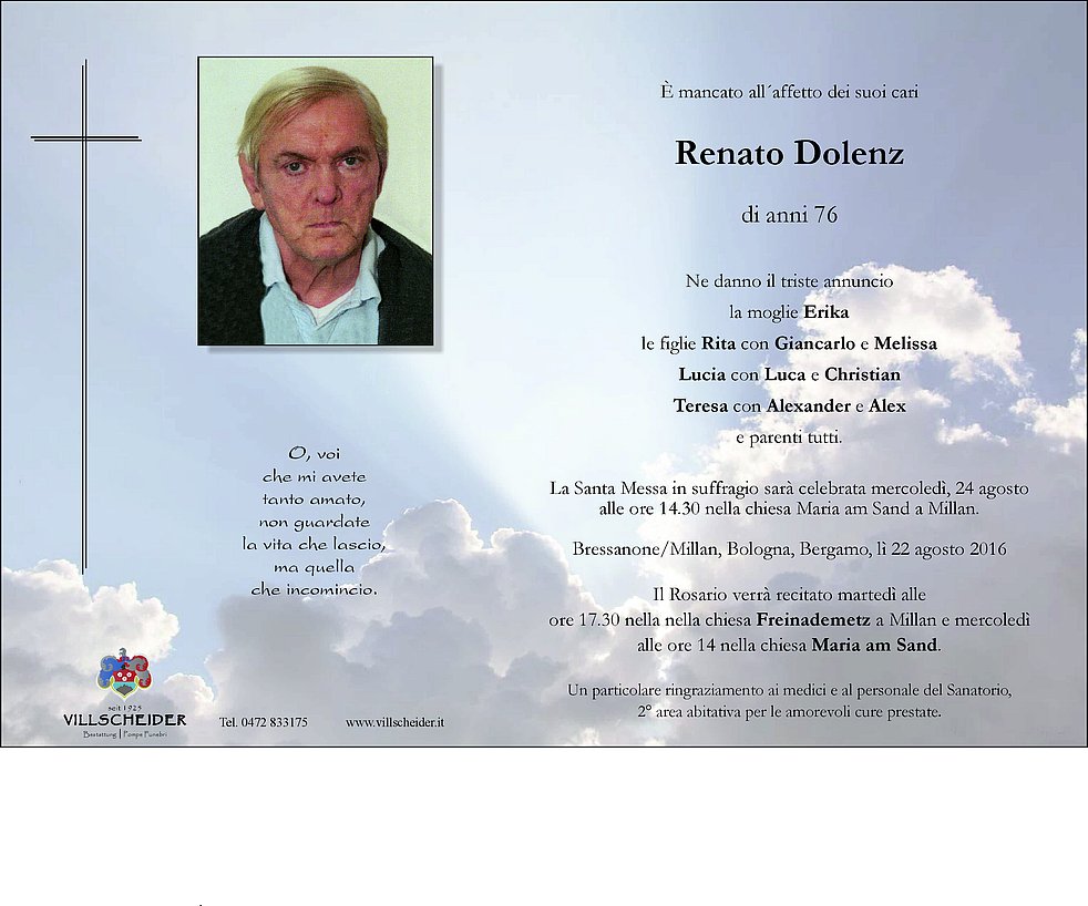 Bressanone/Millan, Bologna, Bergamo, lì 22 agosto 2016