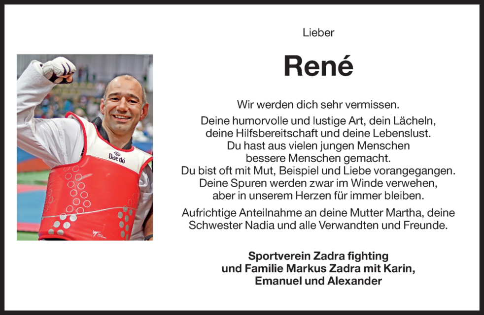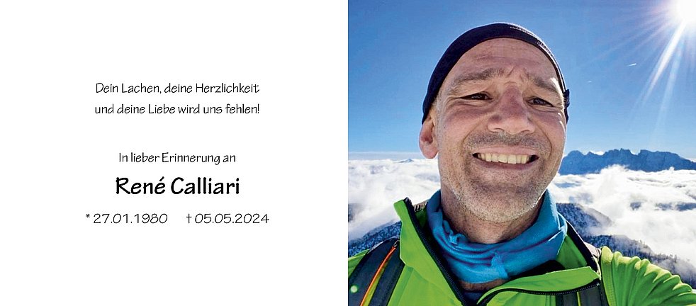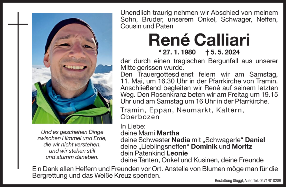 Den Trauergottesdienst feiern wir am Samstag, 11 Mai, um 16.30 Uhr in der Pfarrkirche von Tramin. Anschließend begleiten wir René auf seinem letzten Weg.