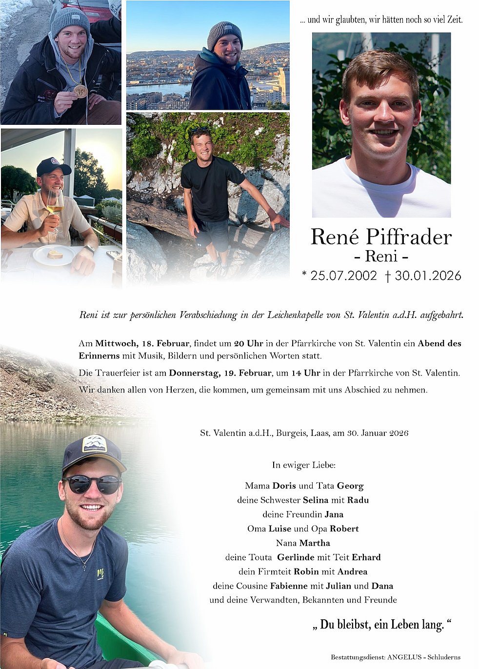 Liebe Trauerfamilie, liebe Luise und lieber Robert, es macht uns unendlich traurig, dass euer geliebter René so plötzlich und so jung aus dem Leben gerissen wurde. Wir wissen, wie viel René euch bedeutet hat wie stolz ihr immer von ihm gesprochen habt, wie sehr euer Herz an ihm hing.