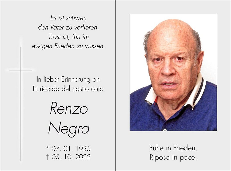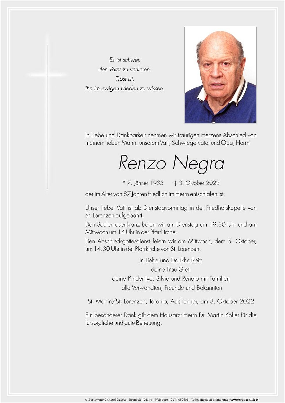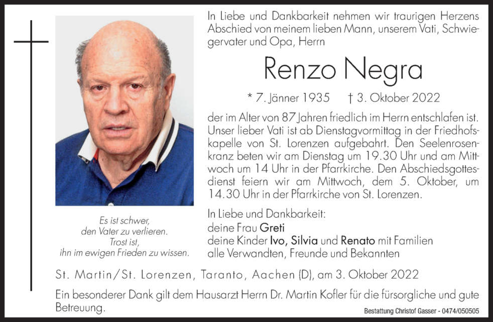 Unser lieber Vati ist ab Dienstagvormittag in der Friedhofskapelle von St. Lorenzen aufgebahrt.