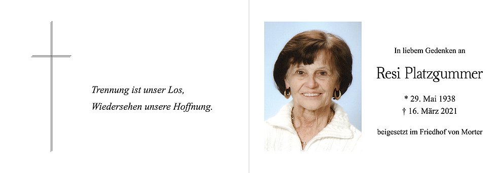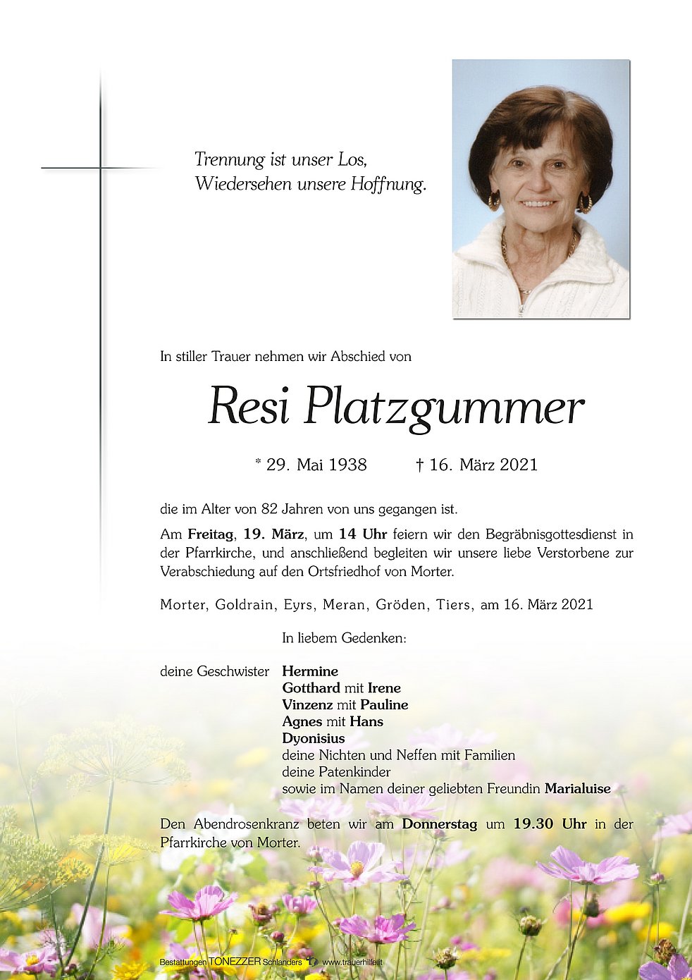 Am Freitag, 19. März, um 14 Uhr feiern wir den Begräbnisgottesdienst in die Pfarrkirche und anschließend begleiten wir unsere liebe Verstorbene zur Verabschiedung auf den Ortsfriedhof von Morter.