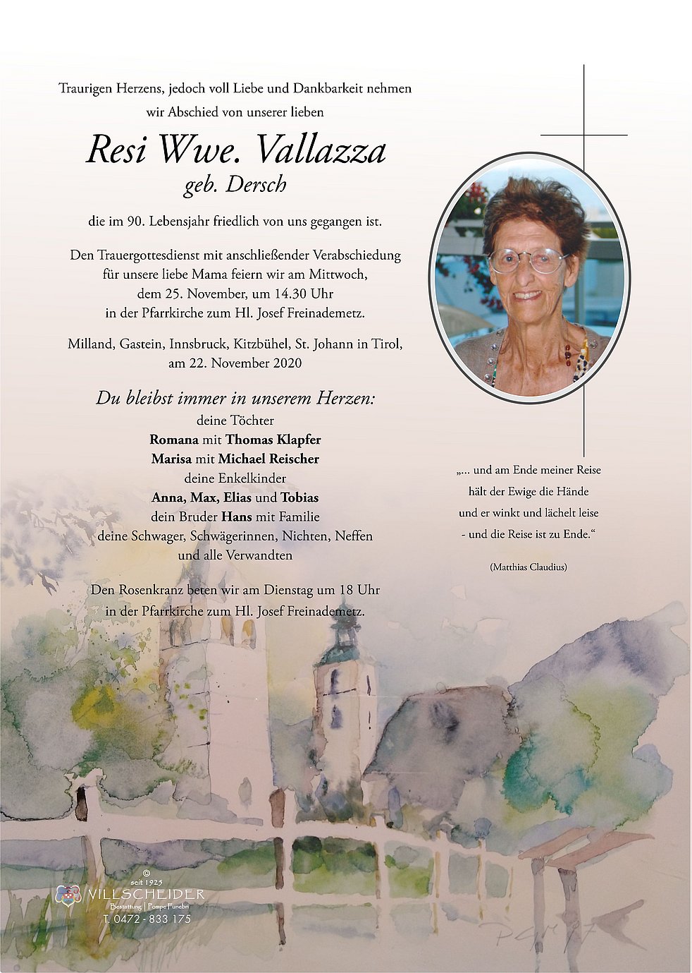 Liebe Romana, liebe Marisa! Ich habe erst jetzt erfahren, dass Eure liebe Mama verstorben ist. Ich denke an so liebe Begegnungen, an viele fröhliche Stunden mit ihr, Tilli und Anna. Ihr herzliches Lachen bleibt mir in Erinnerung. Mir fällt auch mein Besuch mit Tilli bei Resi und Elio ein. Ihr wart auch da und ihr habt uns ein wunderbares Brixen Wochenende beschert. Es kommen mir aber auch Eure Besuche in Kitzbühel in den Sinn und ich erinnere mich daran, wie gerne Resi hier gewesen ist. So bleibt mir nur, Abschied zu nehmen, von der letzten der Dersch Diandln. Danke, Resi, für so viel lustige und schöne Stunden. Der liebe Gott hat Dir schon bei sich einen schönen Platz hergerichtet, wo Du jetzt sein darfst. Und ich glaube, nein, ich weiß, daß wir uns dort alle wiedersehen werden. Euch lieben Töchtern wünsche ich viel Kraft in dieser schweren Zeit. Seid umarmt und aus Kitzbühel lieb gegrüßt von Eurem Andi