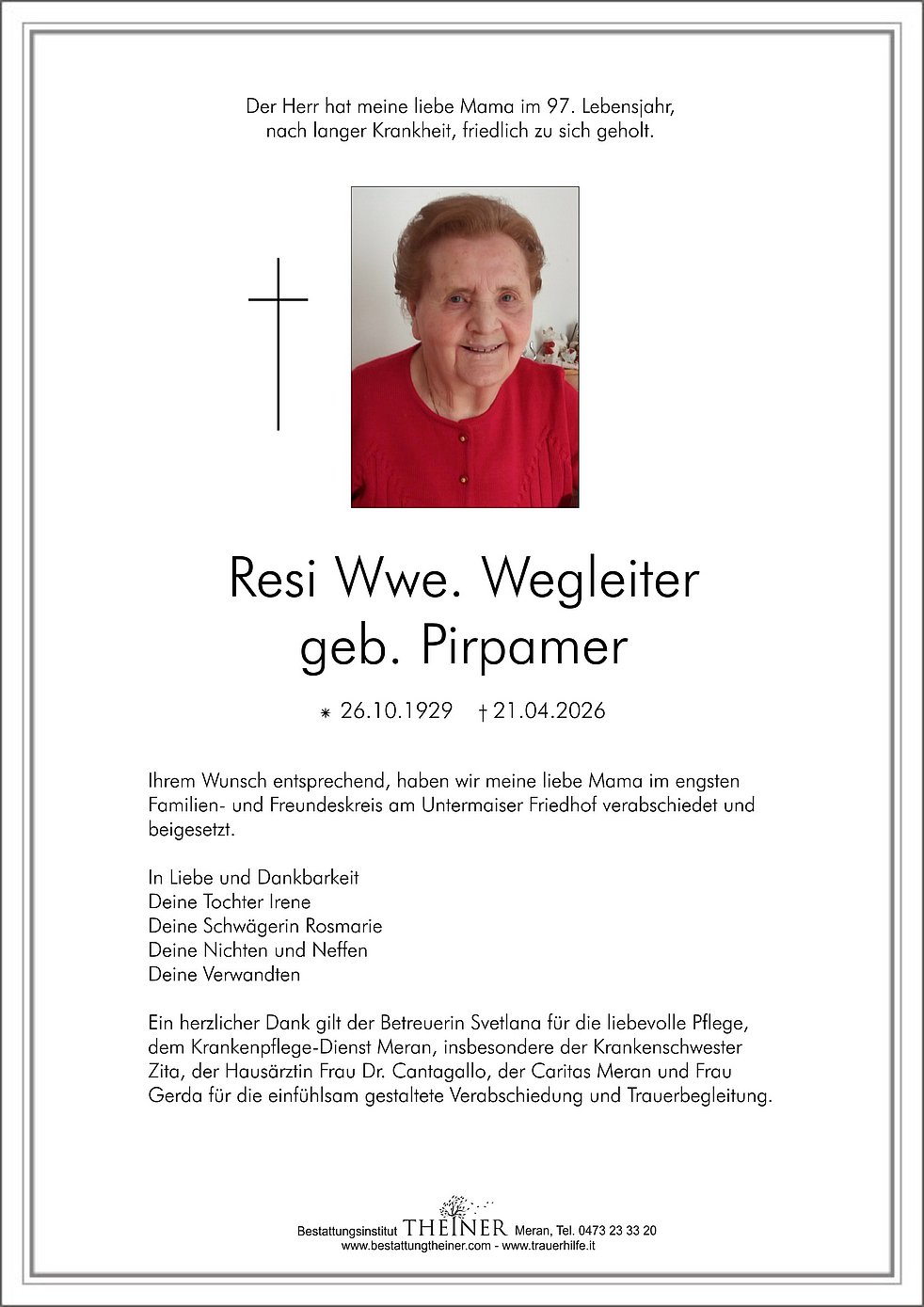 Ein herzlicher Dank gilt der Betreuerin Svetlana für die liebevolle Pflege, dem Krankenpflege-Dienst Meran, insbesondere der Krankenschwester Zita, der Hausärztin Frau Dr. Cantagallo, der Caritas Meran und Frau Gerda für die einfühlsam gestaltete Verabschiedung und Trauerbegleitung.