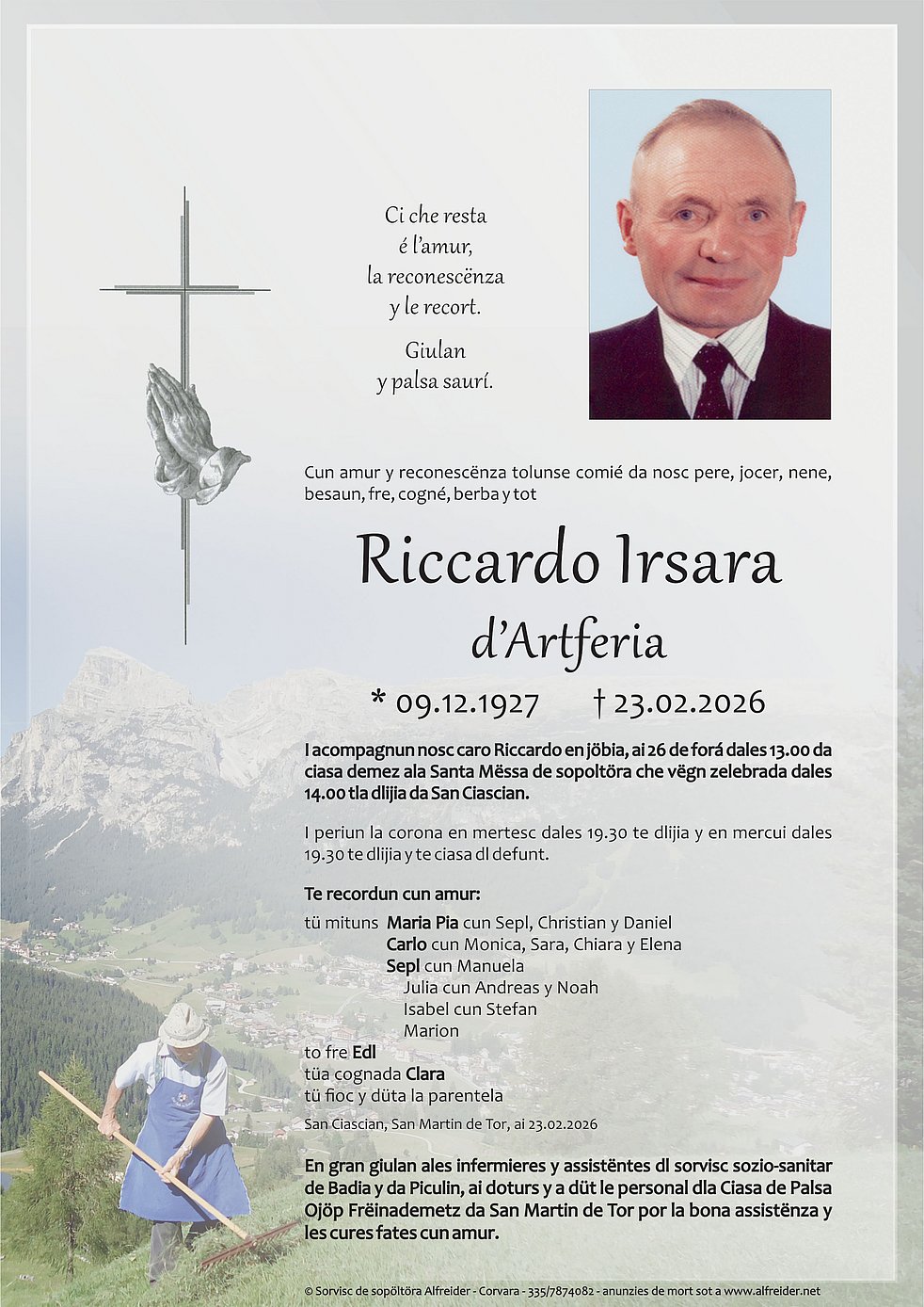 Begräbnisgottesdienst: 26.02. - 14:00 Uhr Pfarrkirche St. Kassian
