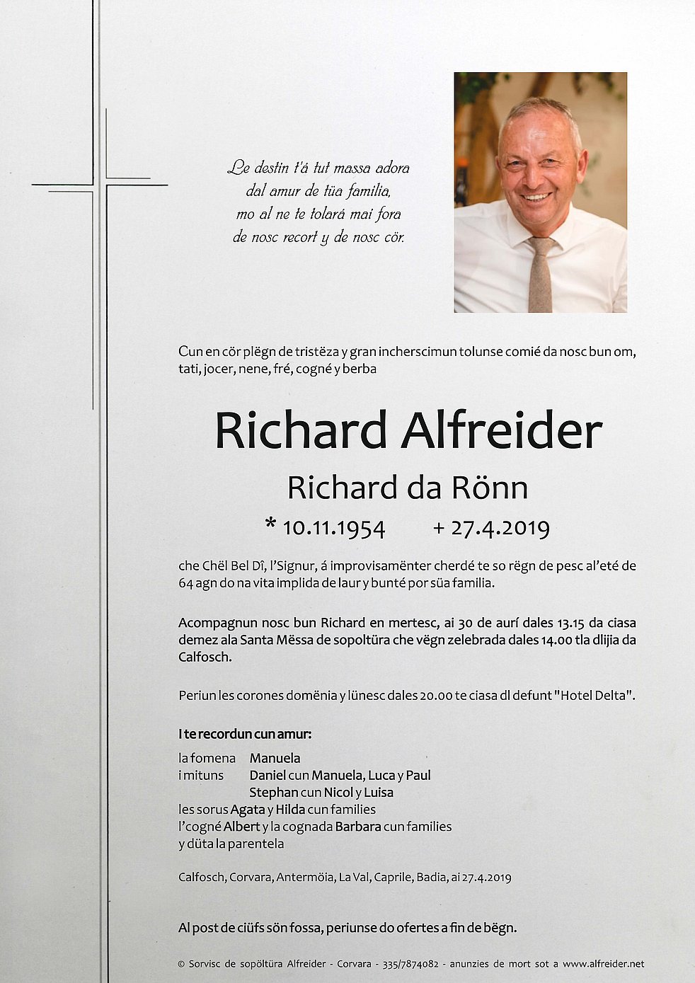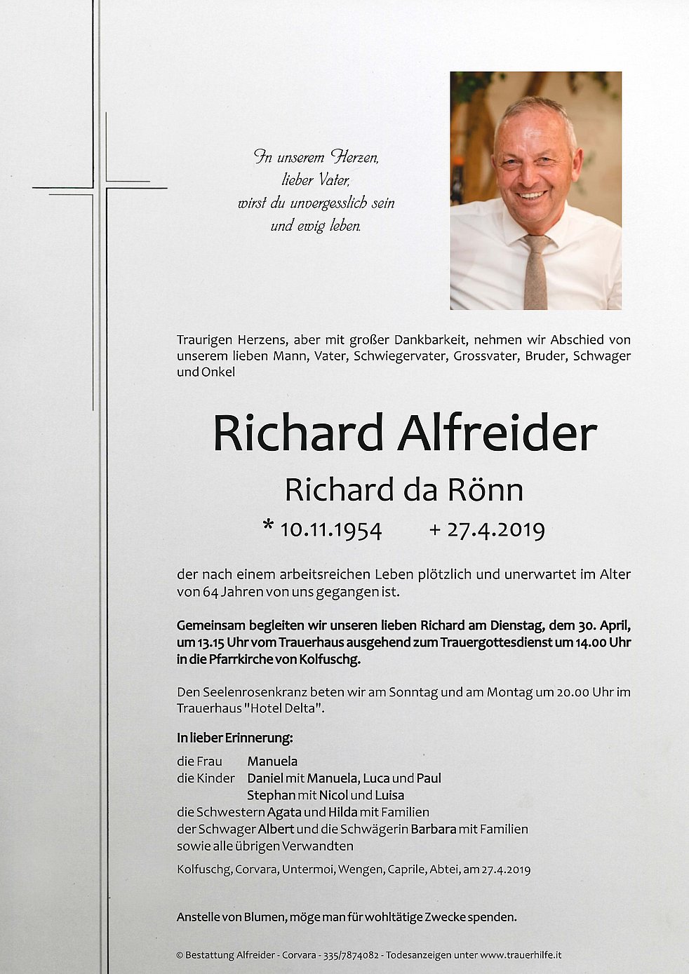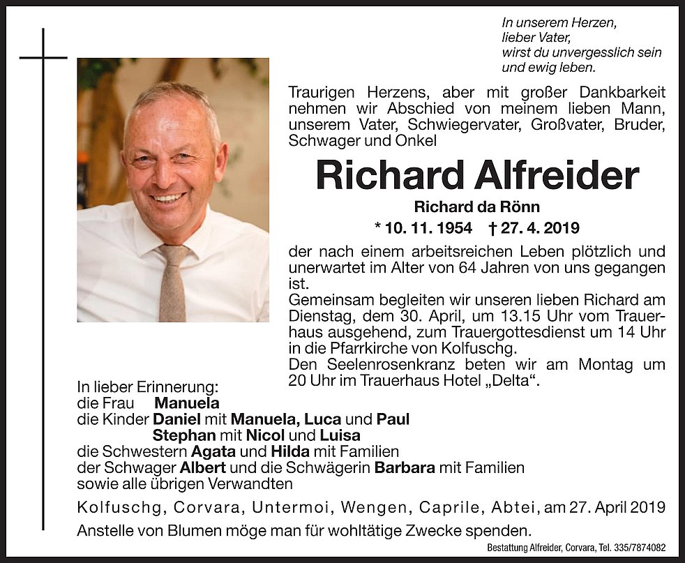 Gemeinsam begleiten wir unseren lieben Richard am Dienstag, dem 30. April, um 13.15 Uhr vom Trauerhaus ausgehend zum Trauergottesdienst um 14.00 Uhr in die Pfarrkirche von Kolfuschg.