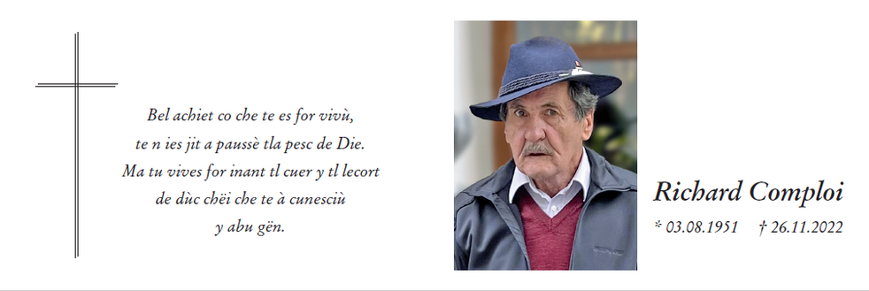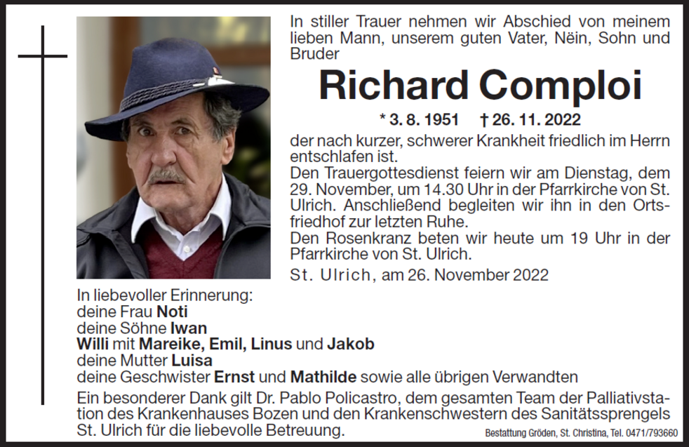 Den Trauergottesdienst feiern wir am Dienstag, dem 29. November, um 14.30 Uhr in der Pfarrkirche von St. Ulrich. Anschließend begleiten wir ihn in den Ortsfriedhof zur letzten Ruhe.