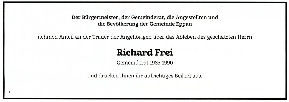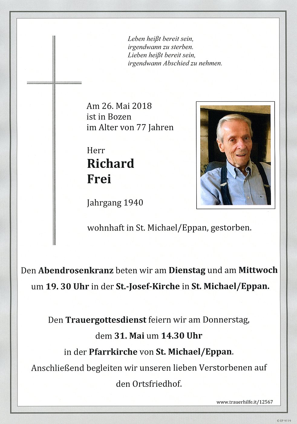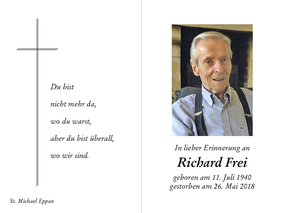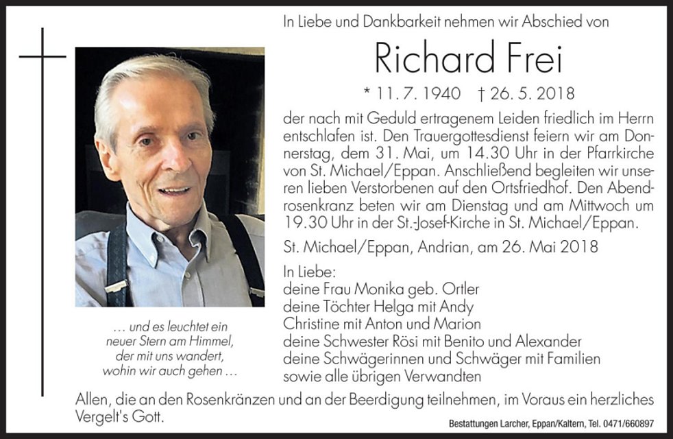 Den Trauergottesdienst feiern wir am Donnerstag, dem 31. Mai um 14.30 Uhr in der Pfarrkirche von St. Michael/Eppan. Anschließend begleiten wir unseren lieben Verstorbenen auf den Ortsfriedhof.