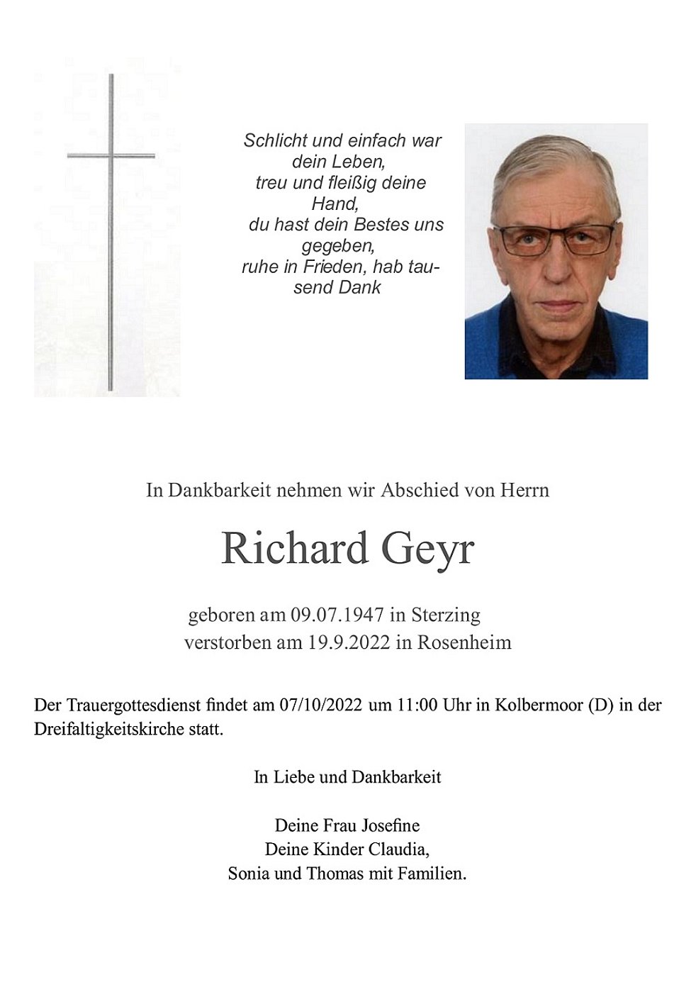 Der Trauergottesdienst findet am Freitag, 07.10.2022 um 11.00 Uhr in Kolbermoor (D) in der Dreifaltigkeitskirche statt.