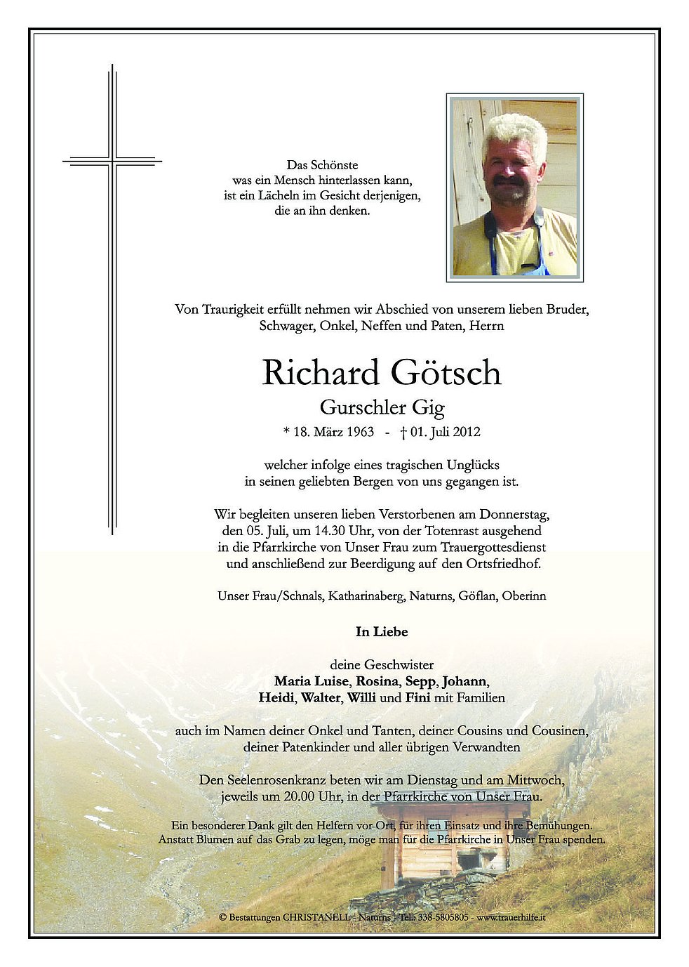 Wir begleiten unseren lieben Verstorbenen am Donnerstag, den 05. Juli, um 14.30 Uhr, von der Totenrast ausgehend in die Pfarrkirche von Unser Frau zum Trauergottesdienst und anschließend zur Beerdigung auf den Ortsfriedhof.