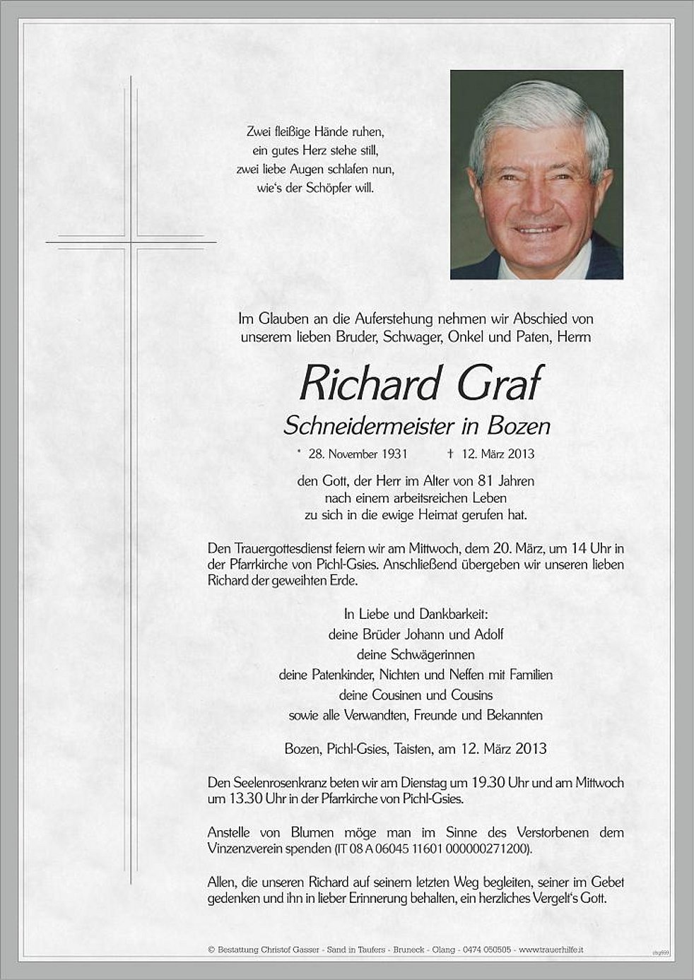 Anstelle von Blumen möge man im Sinne des Verstorbenen dem Vinzenzverein spenden (IT 08 A 06045 11601 000000271200).