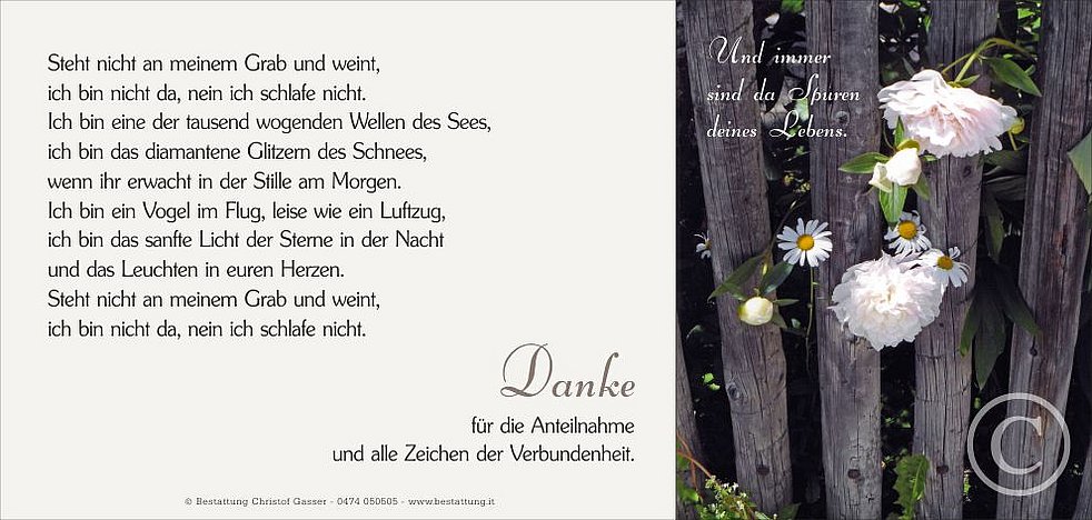 Ein herzlicher Dank gilt dem gesamten Personal vom 5. Wohnbereich des Wohn- und Pflegeheimes Bruneck für die familiäre, liebevolle Betreuung und Begleitung.