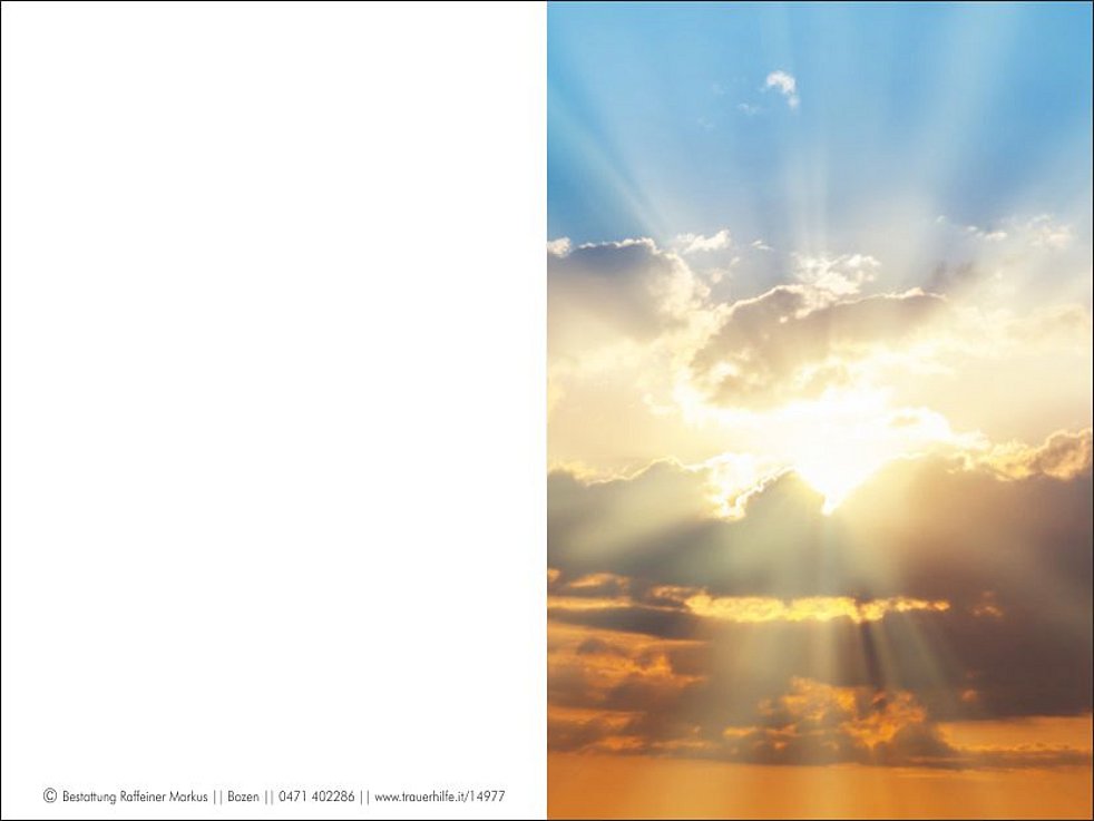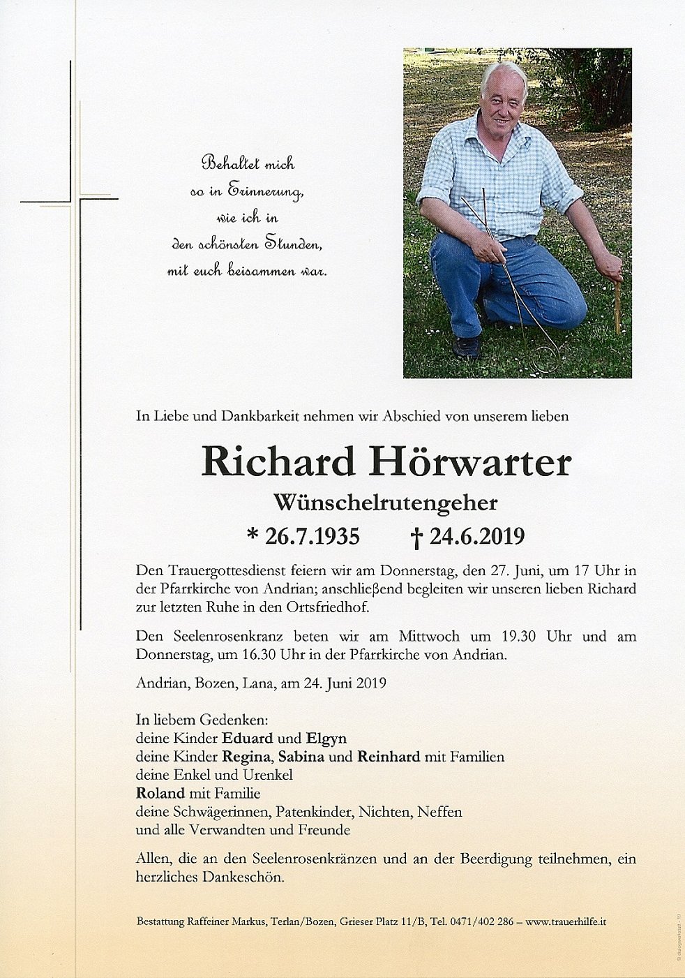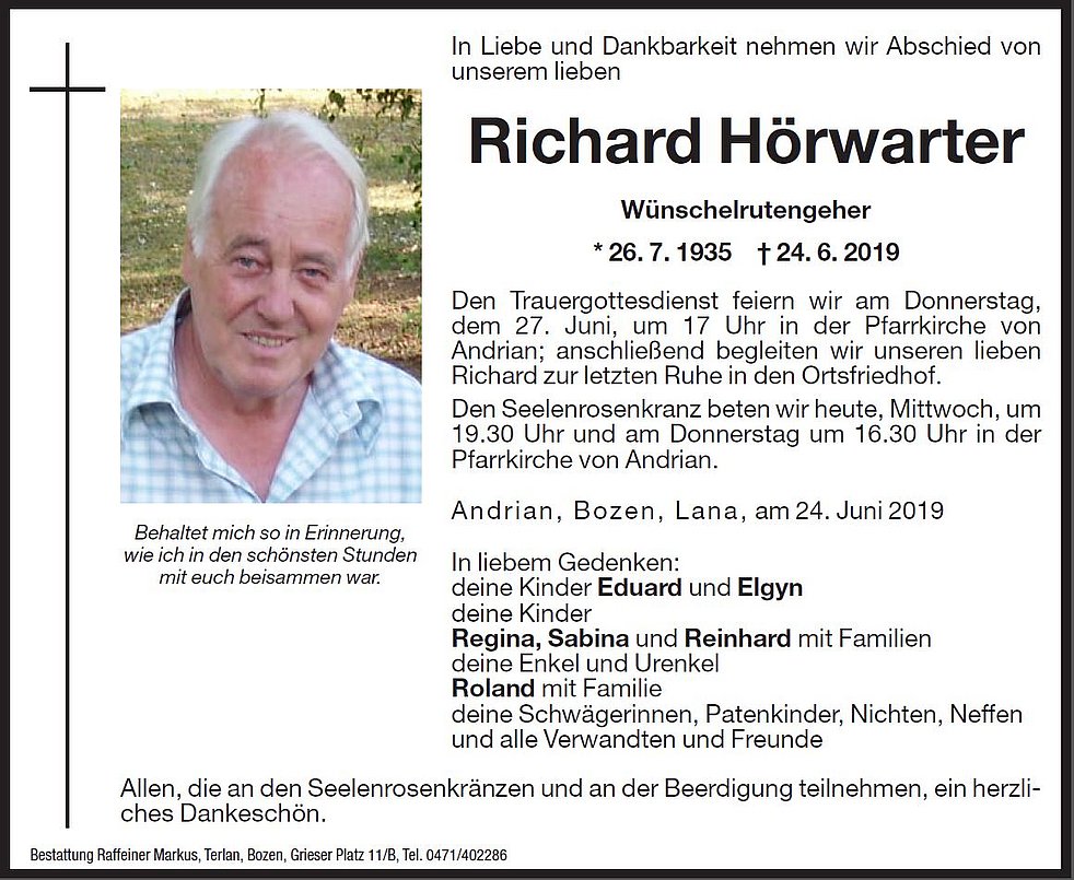 Den Trauergottesdienst feiern wir am Donnerstag, den 27. Juni, um 17 Uhr in der Pfarrkirche von Andrian; anschlieβend begleiten wir unseren lieben Richard zur letzten Ruhe in den Ortsfriedhof.