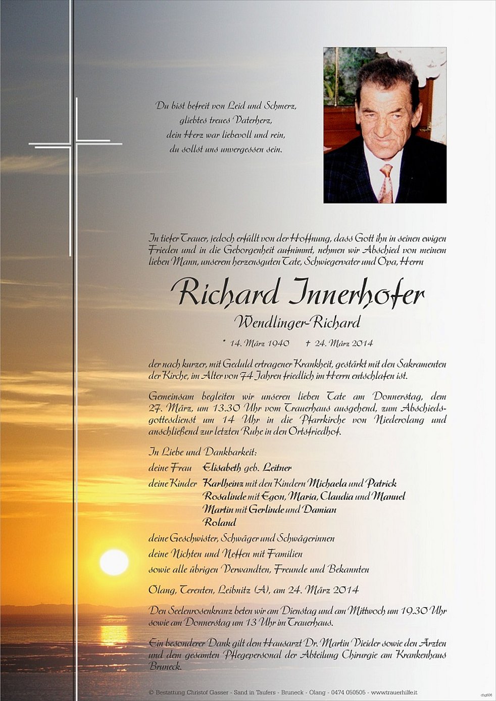 In tiefer Trauer, jedoch erfüllt von der Hoffnung, dass Gott ihn in seinen ewigen Frieden und in die Geborgenheit aufnimmt, nehmen wir Abschied von meinem lieben Mann, unserem herzensguten Tate, Schwiegervater und Opa, Herrn