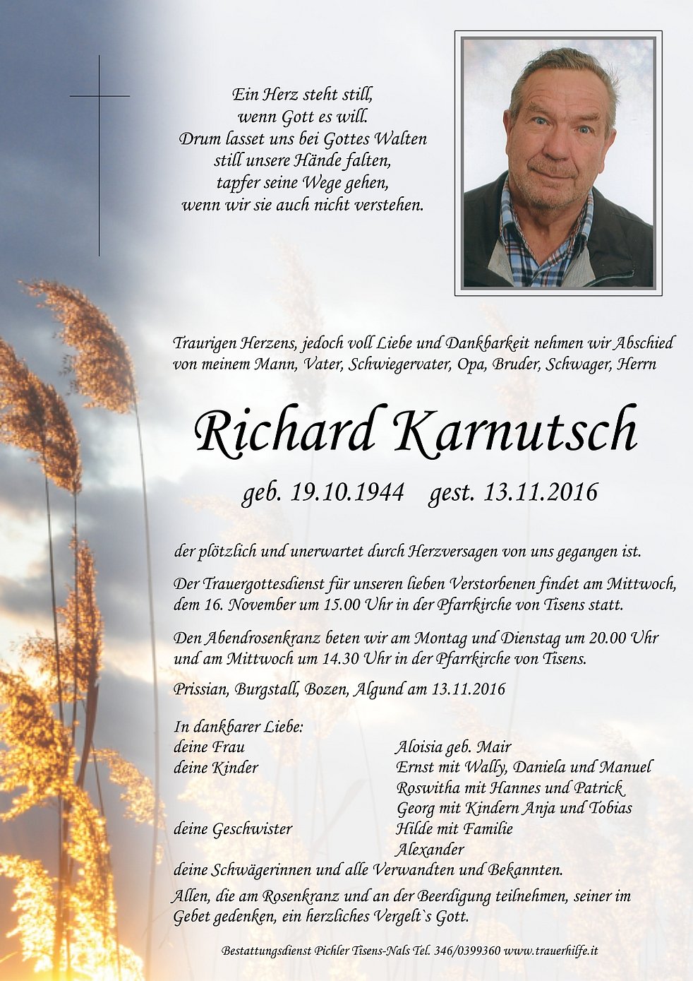 dem 16. November um 15.00 Uhr in der Pfarrkirche von Tisens statt.