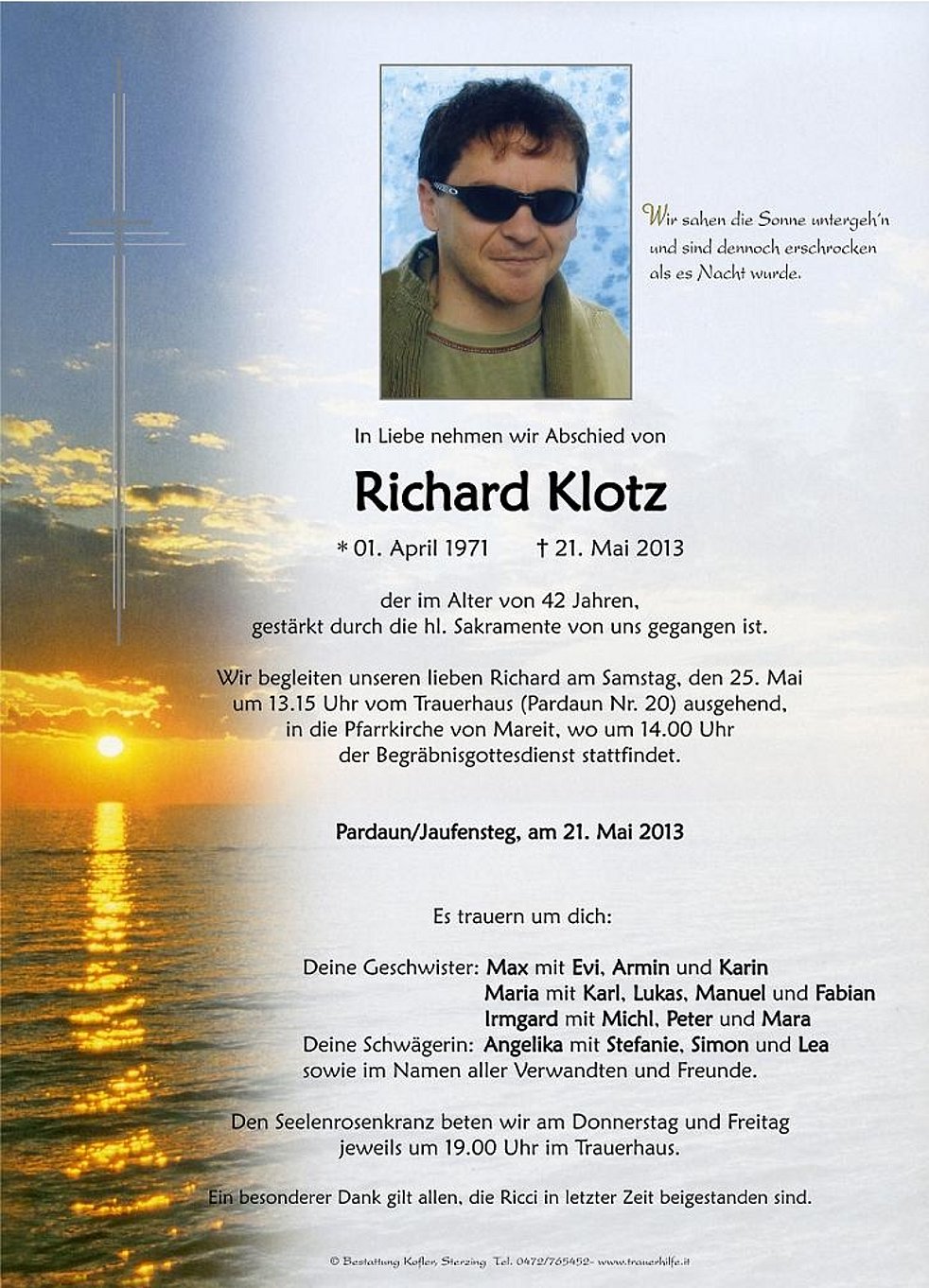 Wir sahen die Sonne untergeh´n und sind dennoch erschrocken als es Nacht wurde. In Liebe nehmen wir Abschied von Richard Klotz * 01. April 1971 † 21. Mai 2013 der im Alter von 42 Jahren, gestärkt durch die hl. Sakramente von uns gegangen ist. Wir begleiten unseren lieben Richard am Samstag, den 25. Mai um 13.15 Uhr vom Trauerhaus (Pardaun Nr. 20) ausgehend, in die Pfarrkirche von Mareit, wo um 14.00 Uhr der Begräbnisgottesdienst stattfindet. Pardaun/Jaufensteg, am 21. Mai 2013 Es trauern um dich: Deine Geschwister: Max mit Evi, Armin und Karin Maria mit Karl, Lukas, Manuel und Fabian Irmgard mit Michl, Peter und Mara Deine Schwägerin: Angelika mit Stefanie, Simon und Lea sowie im Namen aller Verwandten und Freunde. Den Seelenrosenkranz beten wir am Donnerstag und Freitag jeweils um 19.00 Uhr im Trauerhaus. Ein besonderer Dank gilt allen, die Ricci in letzter Zeit beigestanden sind.