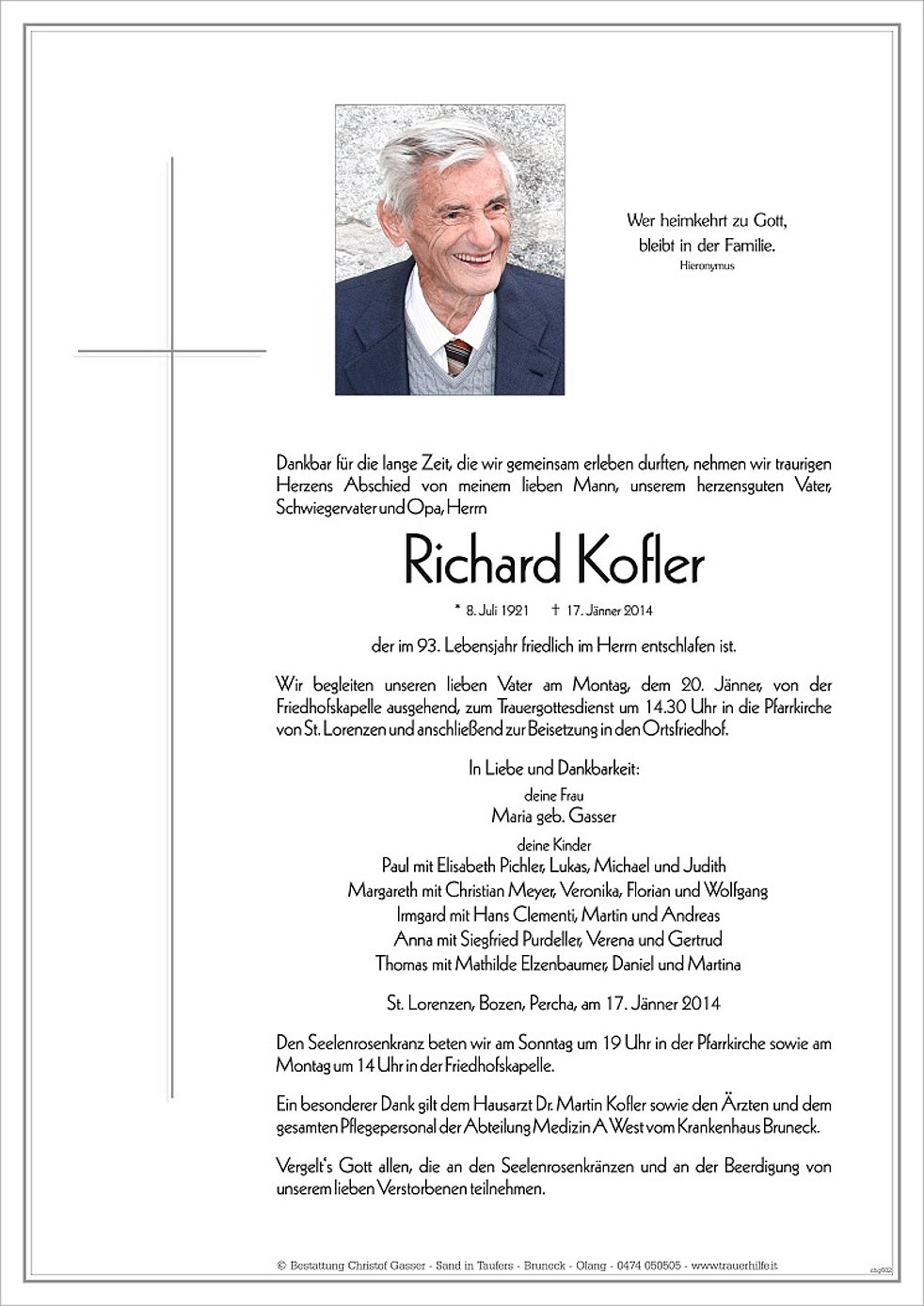 Wir begleiten unseren lieben Vater am Montag, dem 20. Jänner, von der Friedhofskapelle ausgehend, zum Trauergottesdienst um 14.30 Uhr in die Pfarrkirche von St. Lorenzen und anschließend zur Beisetzung in den Ortsfriedhof.