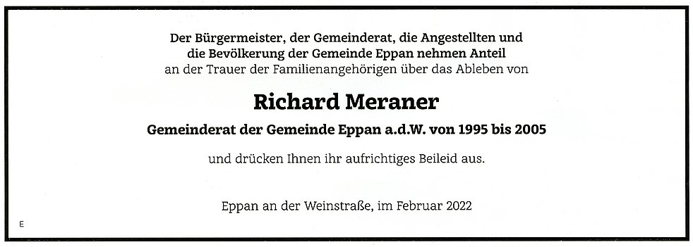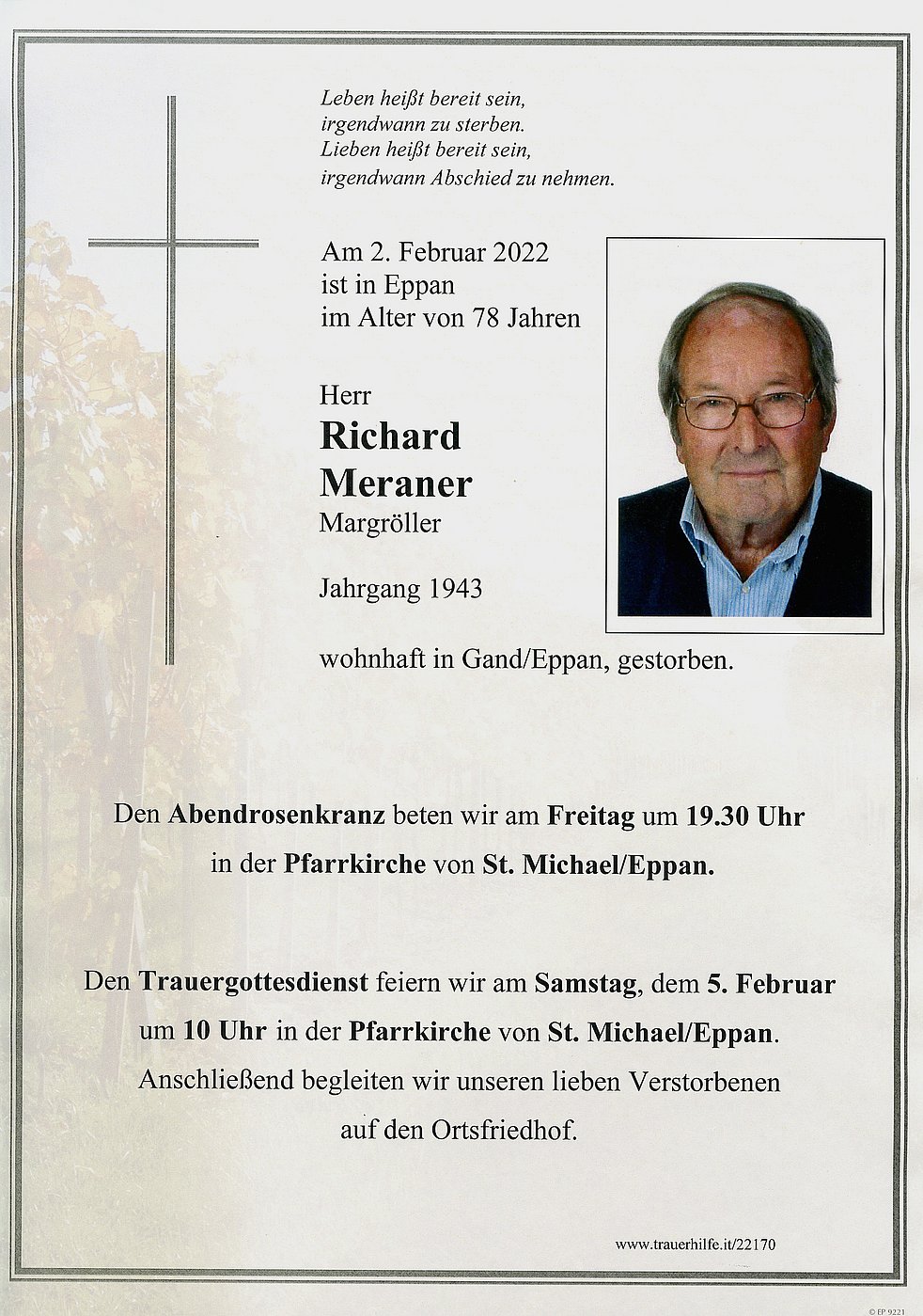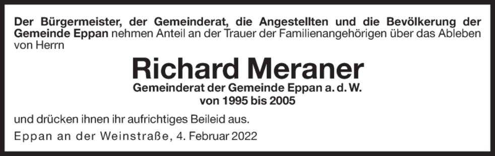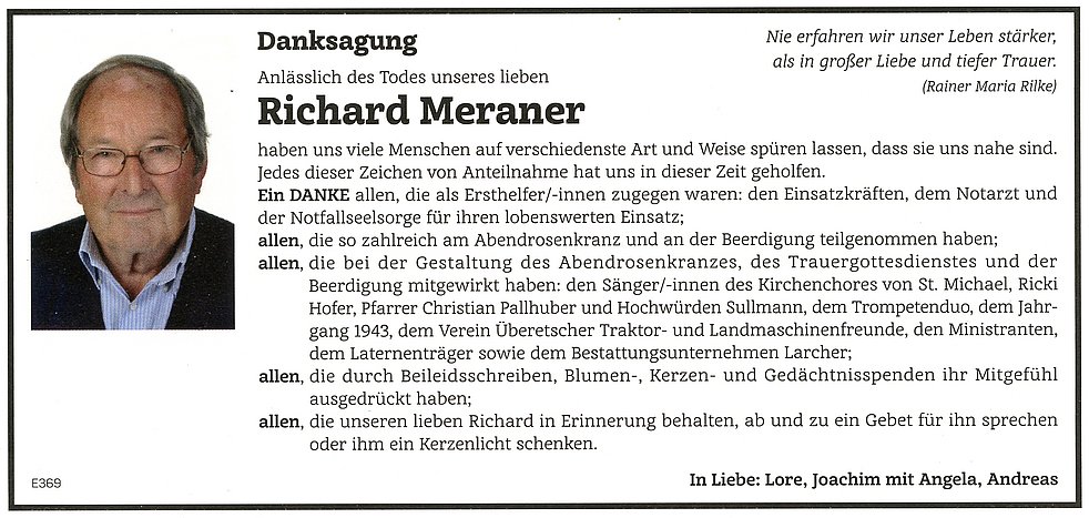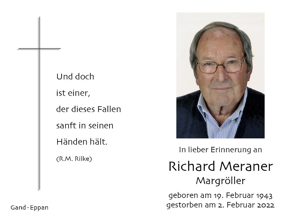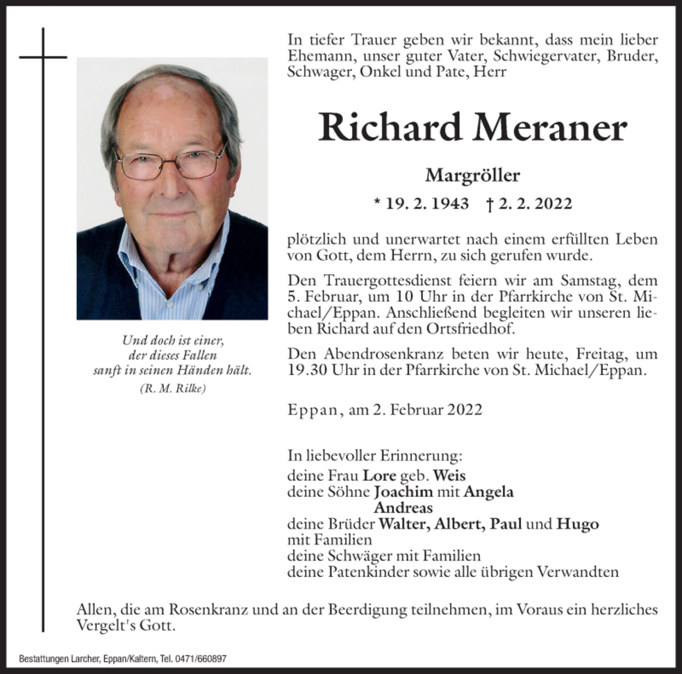Den Trauergottesdienst feiern wir am Samstag, dem 5. Februar um 10 Uhr in der Pfarrkirche von St. Michael/Eppan. Anschließend begleiten wir unseren lieben Richard auf den Ortsfriedhof.
