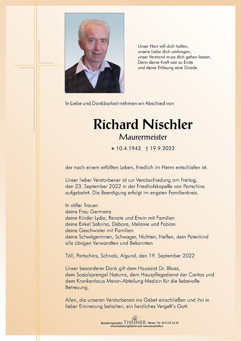 Unser lieber Verstorbener ist zur Verabschiedung am Freitag, den 23. September 2022 in der Friedhofskapelle von Partschins aufgebahrt. Die Beerdigung erfolgt im engsten Familienkreis.