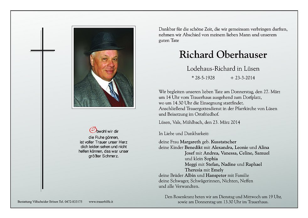 sowie am Donnerstag um 13.30 Uhr im Trauerhaus.