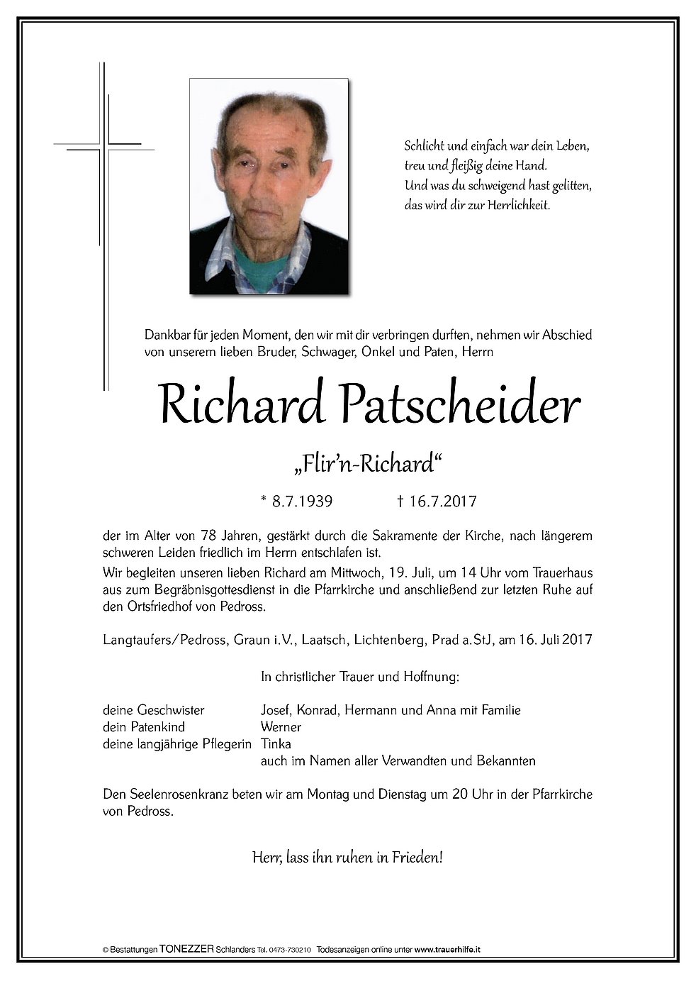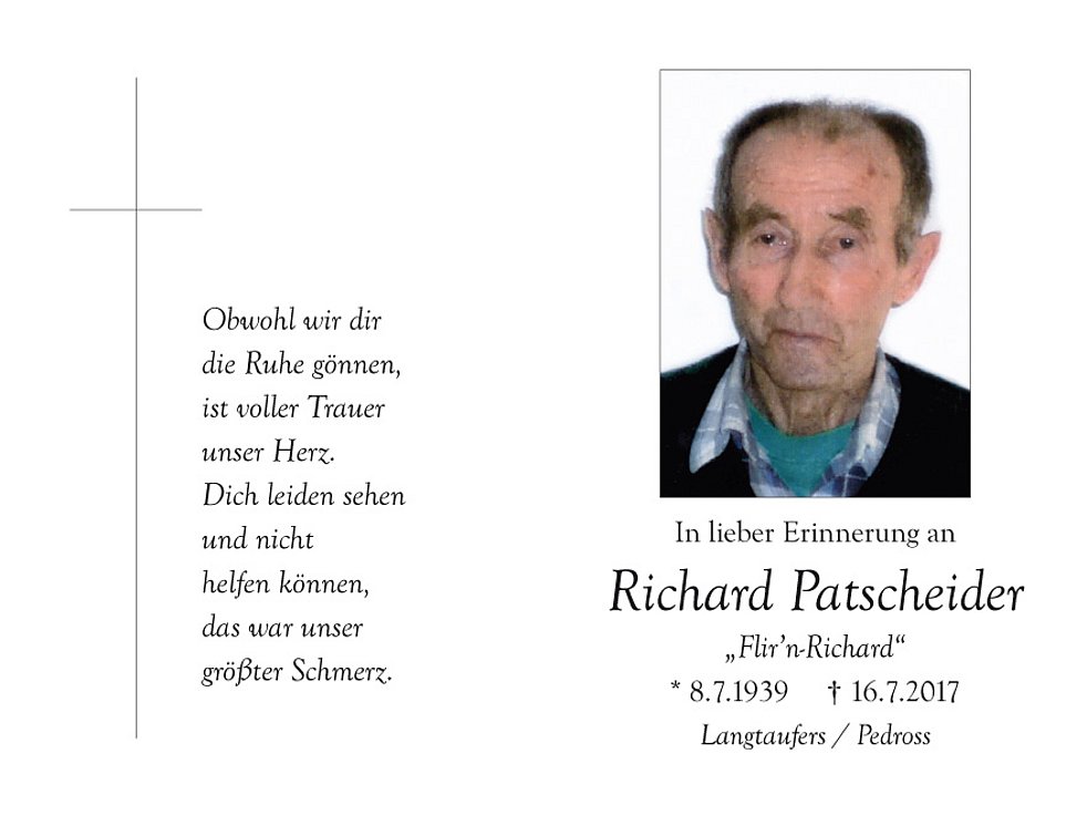 Wir begleiten unseren lieben Richard am Mittwoch, 19. Juli, um 14 Uhr vom Trauerhaus aus zum Begräbnisgottesdienst in die Pfarrkirche und anschließend zur letzten Ruhe auf den Ortsfriedhof von Pedross.