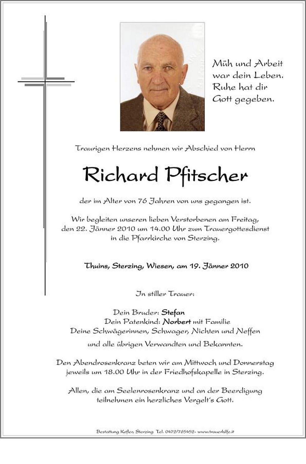 den 22. Jänner 2010 um 14.00 Uhr zum Trauergottesdienst