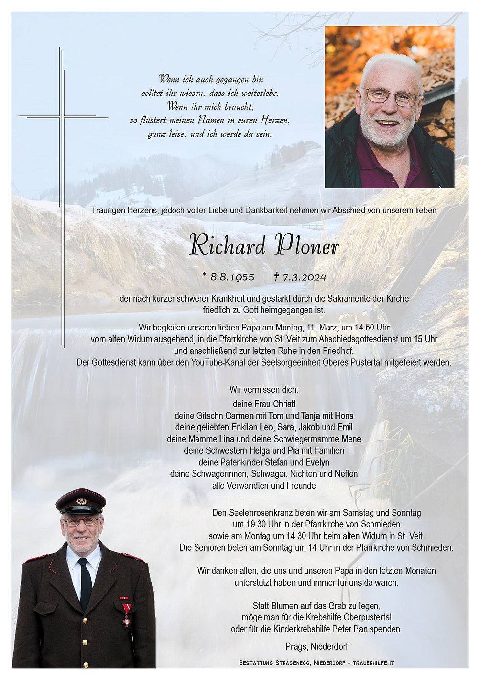 Liebe Frau Ploner, Helga und Pia, tief betroffen möchte ich euch angesichts eures Schmerzes um Richard mein aufrichtiges Mitgefühl ausdrücken und dies ganz fest auch Richards Familie. Möget ihr über die Schwere des Schicksals hinaus wachsen, es als Fügung und Plan Gottes begreifen und daraus Kraft schöpfen, ihn anzunehmen, euch aus der Trauer heraus wieder nach und nach aufzurichten mit großem Vertrauen, dass in euch als Hinterbliebene ein Herz voll Liebe und all den Erinnerungen bleibt, euer Richard jedoch Vollendung, Glück, und Frieden finden wird bei seinem Schöpfer im Himmel.