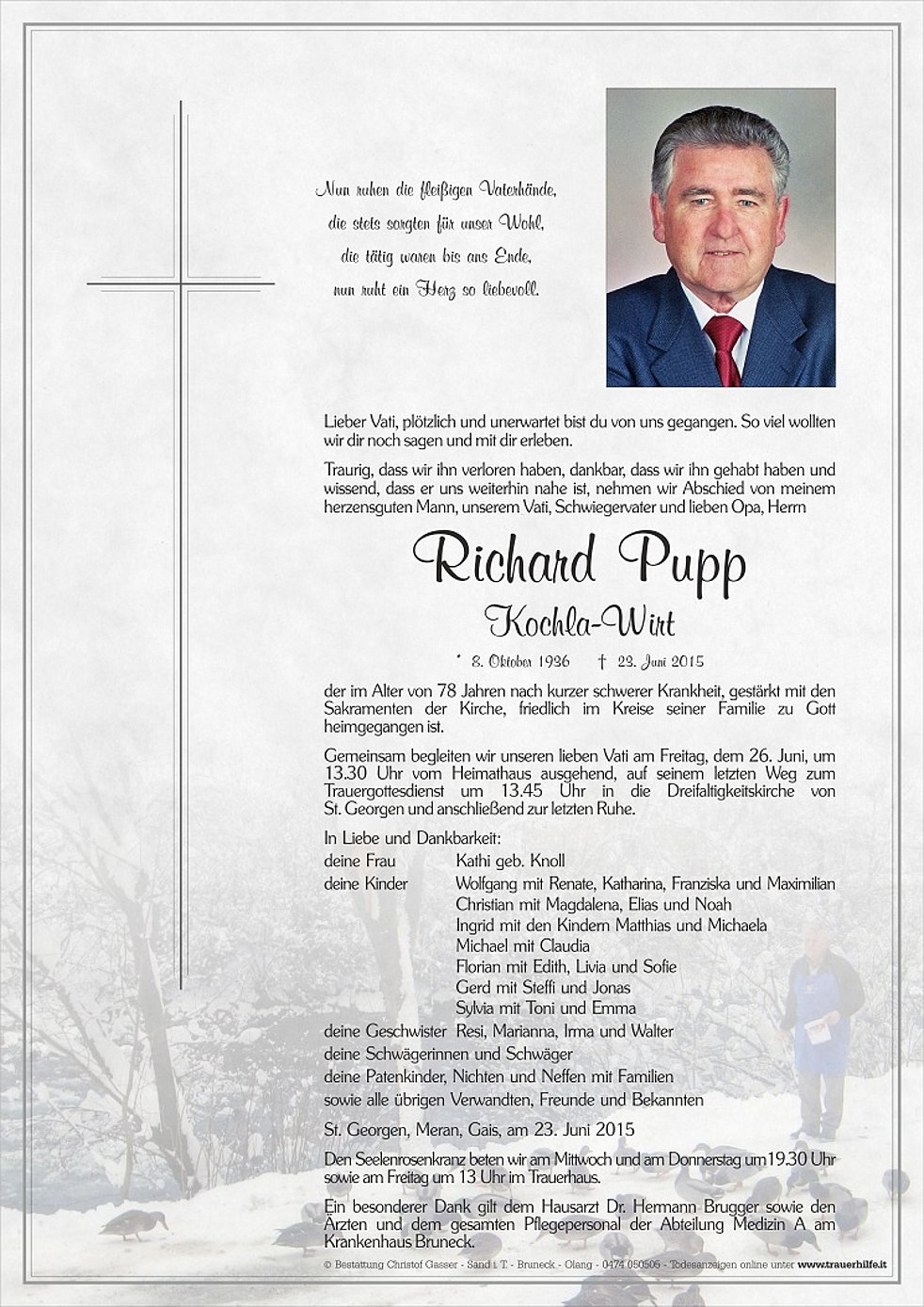Traurig, dass wir ihn verloren haben, dankbar, dass wir ihn gehabt haben und wissend, dass er uns weiterhin nahe ist, nehmen wir Abschied von meinem herzensguten Mann, unserem Vati, Schwiegervater und lieben Opa, Herrn