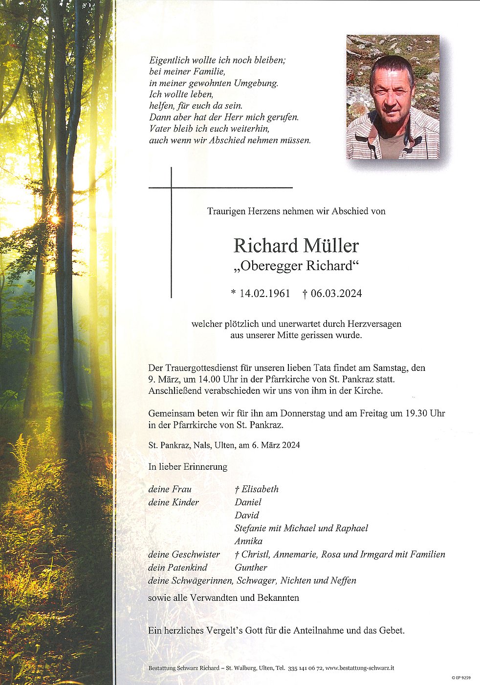 Der Trauergottesdienst für unseren lieben Tata findet am Samstag, den 9. März, um 14.00 Uhr in der Pfarrkirche von St. Pankraz statt.