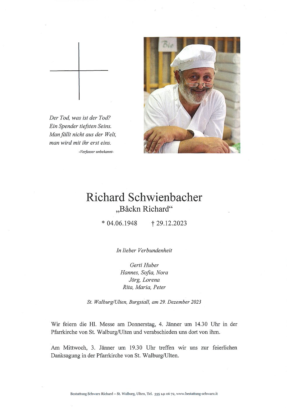 Wir feiern die Hl. Messe am Donnerstag, 4. Jänner um 14.30 Uhr in der Pfarrkirche von St. Walburg/Ulten und verabschieden uns dort von ihm.