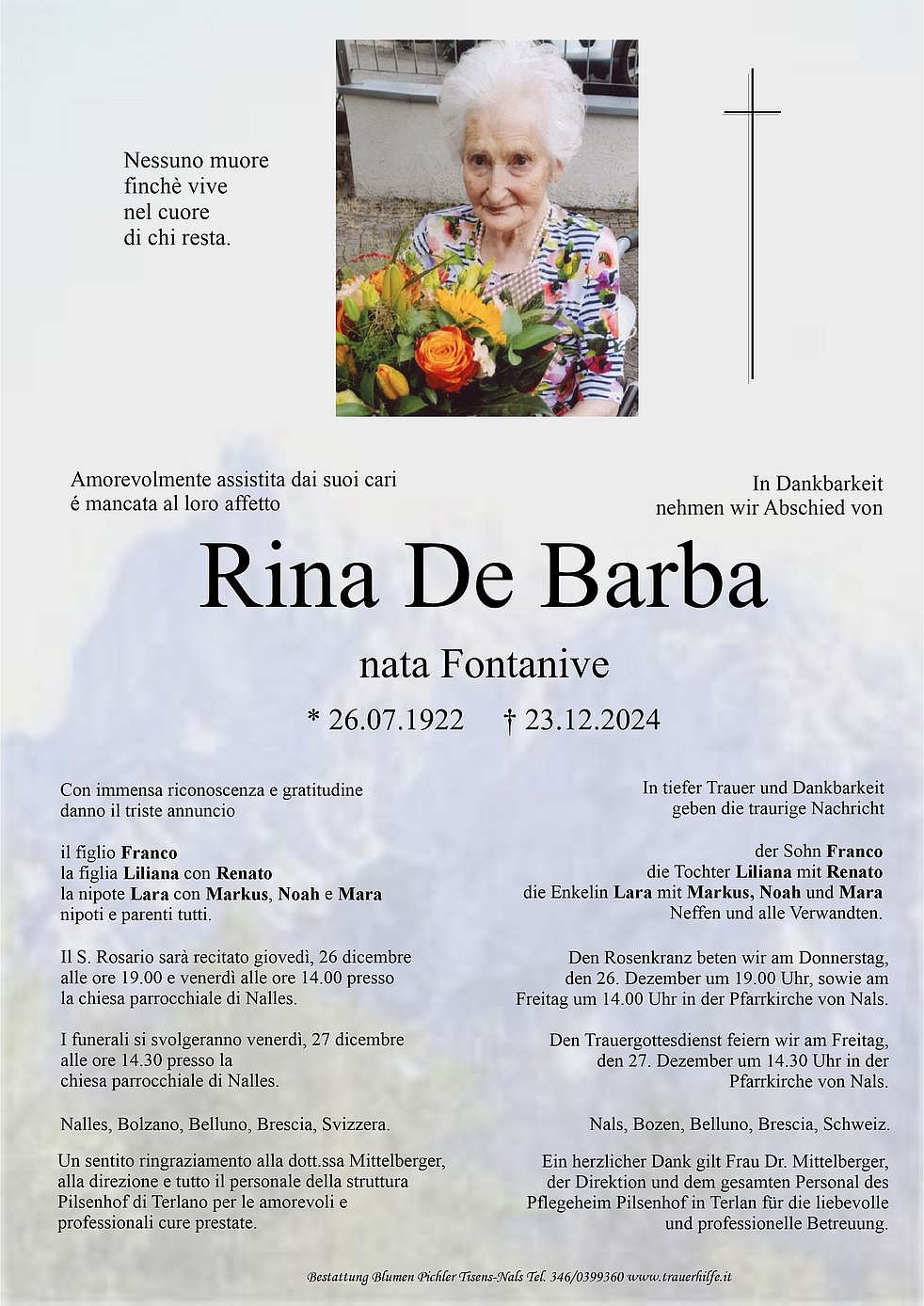 Begräbnisgottesdienst: 27.12. - 14:30 Uhr Pfarrkirche Nals