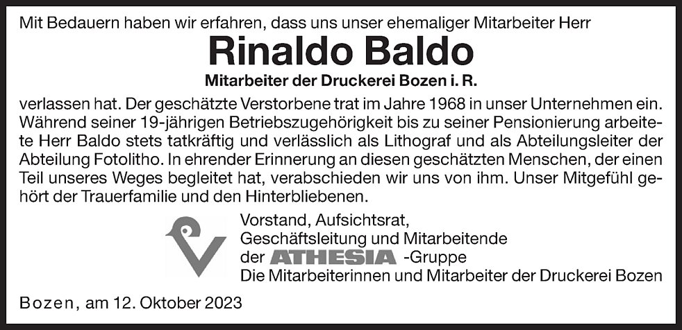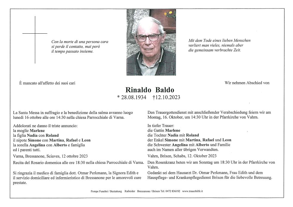 Trauerfeier: 16.10. - 14:30 Uhr Pfarrkirche Vahrn