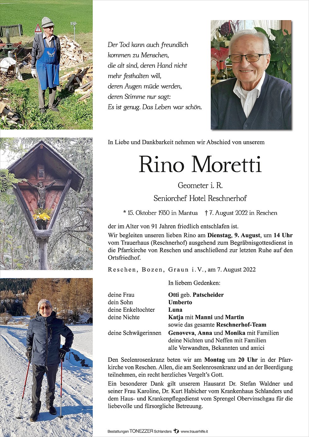 Wir begleiten unseren lieben Rino am Dienstag, 9. August, um 14 Uhr vom Trauerhaus (Reschnerhof) ausgehend zum Begräbnisgottesdienst in die Pfarrkirche von Reschen und anschließend zur letzten Ruhe auf den Ortsfriedhof.
