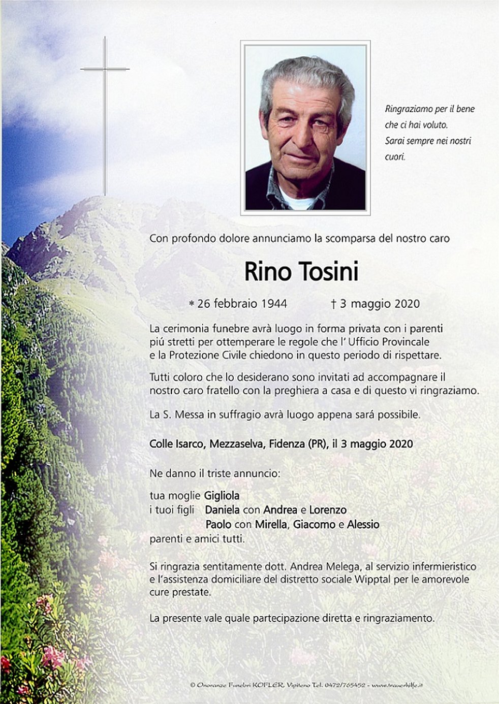 La cerimonia funebre avrà luogo in forma privata con i parenti piú stretti per ottemperare le regole che l‘ Ufficio Provincale e la Protezione Civile chiedono in questo periodo di rispettare.